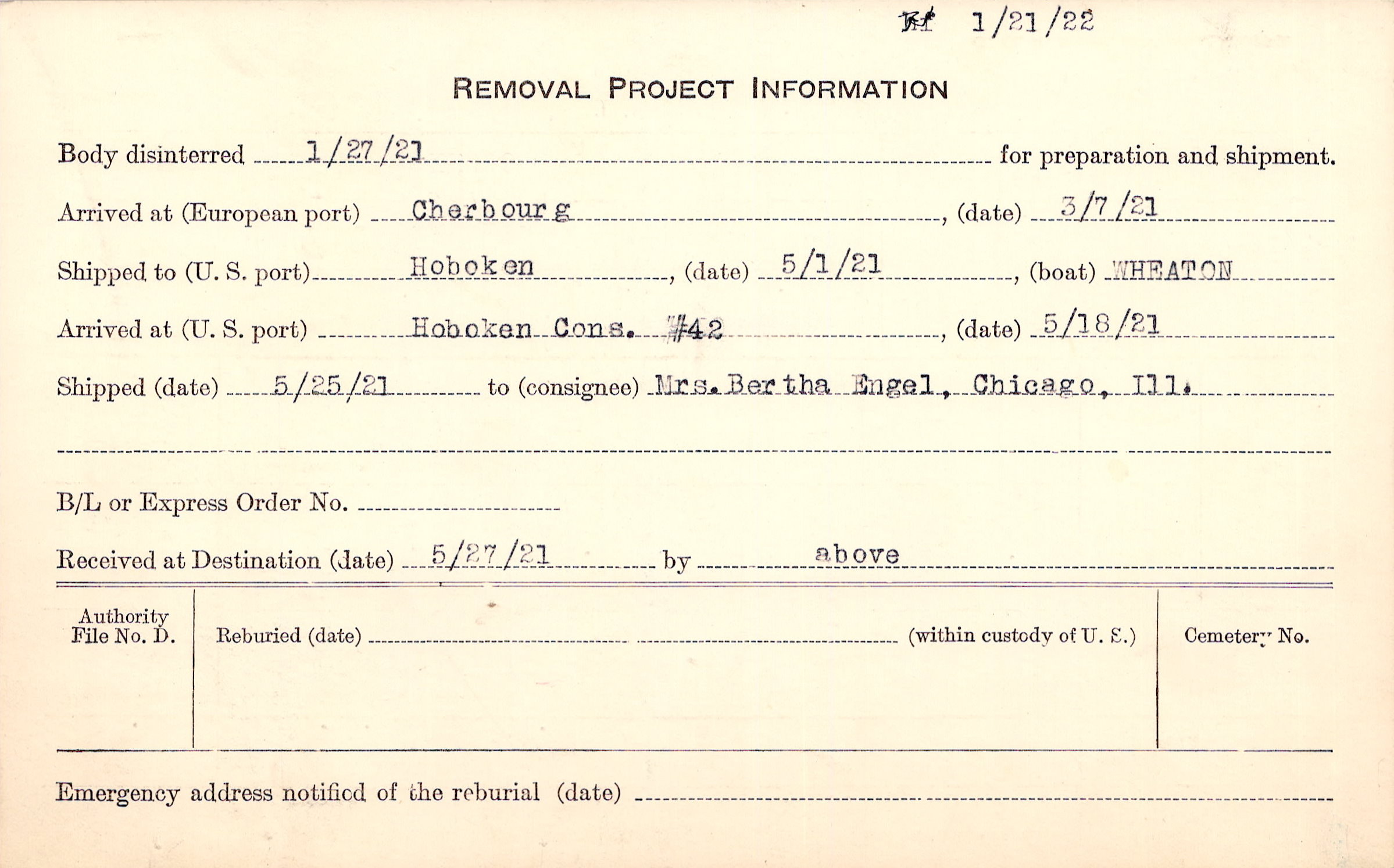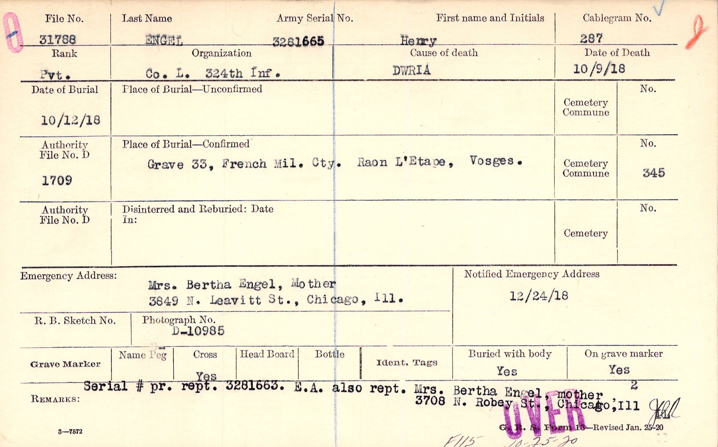 Serial # pr. rept. 3281663. E.A. also rept. Mrs. Bertha Engel, mother, 3708 N. Robey St., Chicago, Ill, F115 - 10-25-20