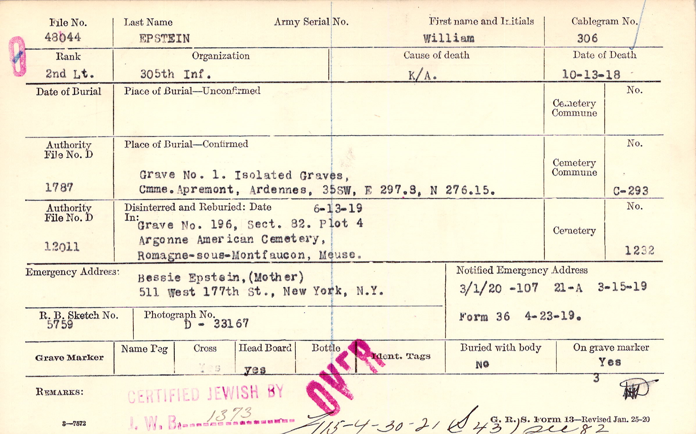 Bessie Epstein, (Mother), 511 West 177th St., New York, N.Y.