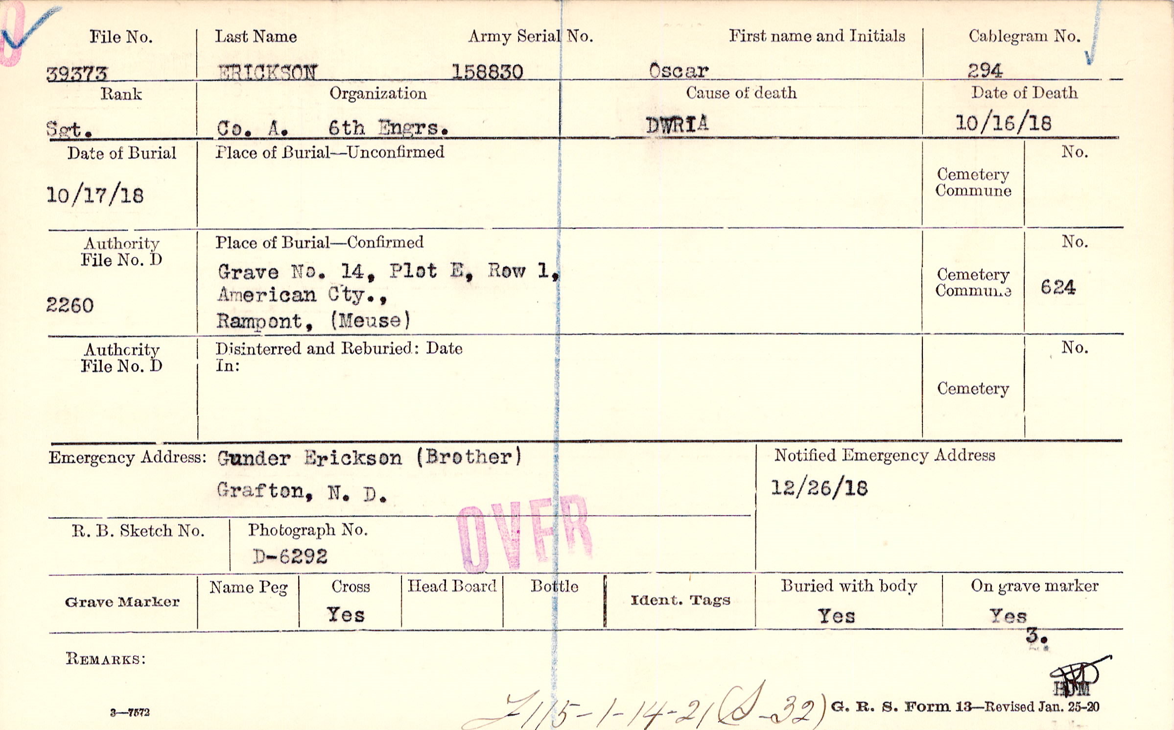 Grave 14, Plot E, Row 1, American Cty., Rampont, Meuse