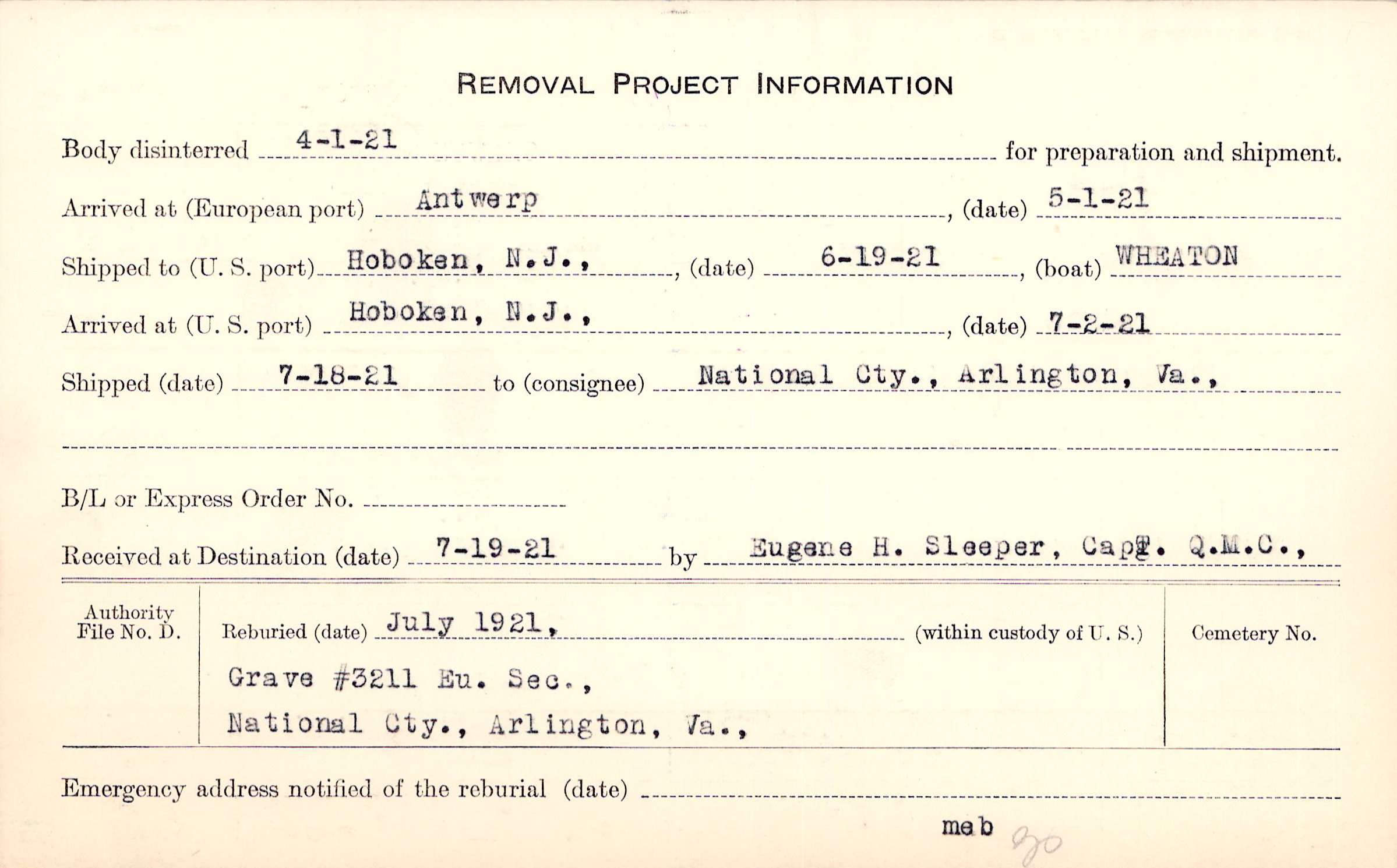 Body disinterred 4/1/1921 for preparation and shipment.