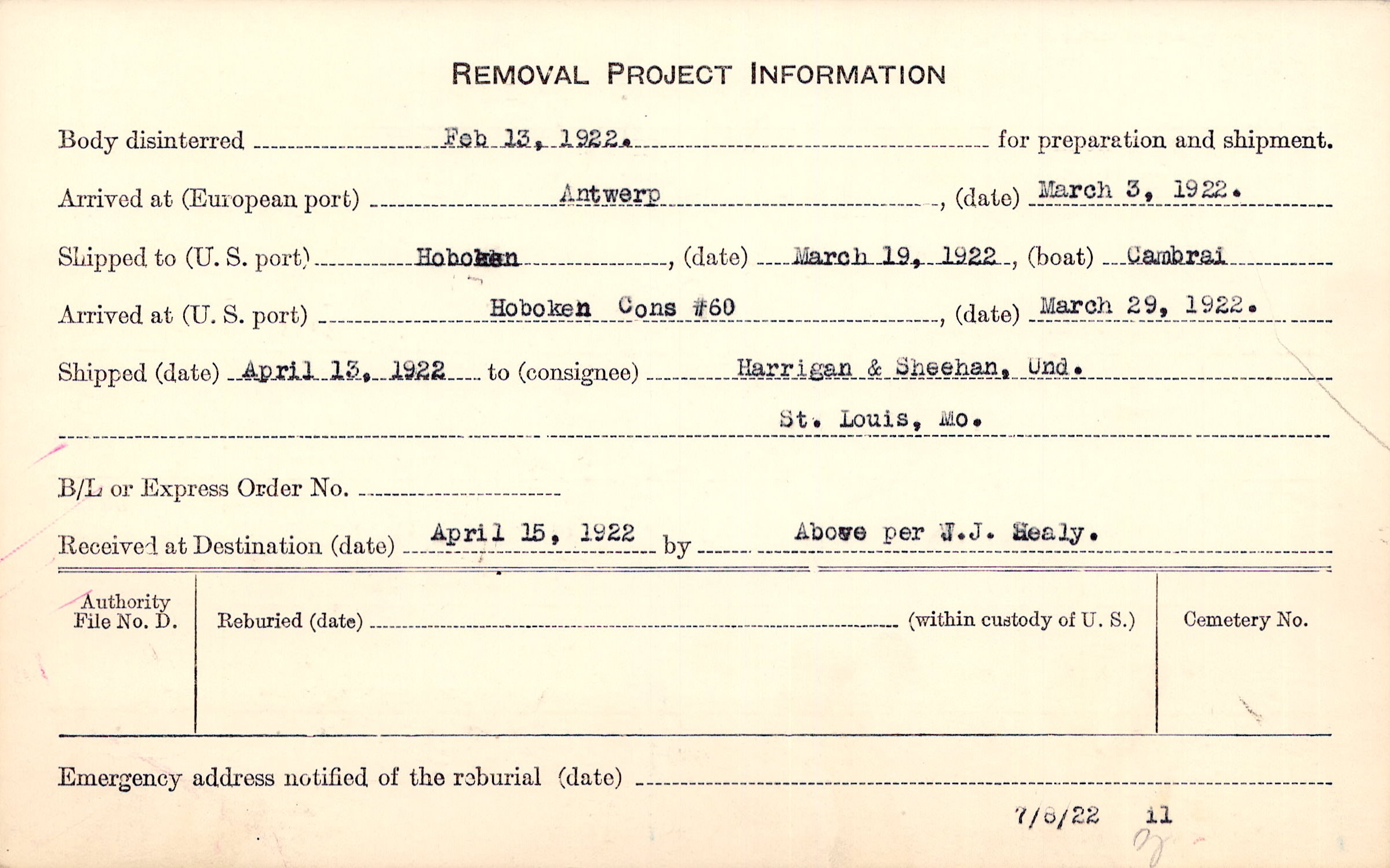 Body disinterred 2/13/1922 for preparation and shipment.
