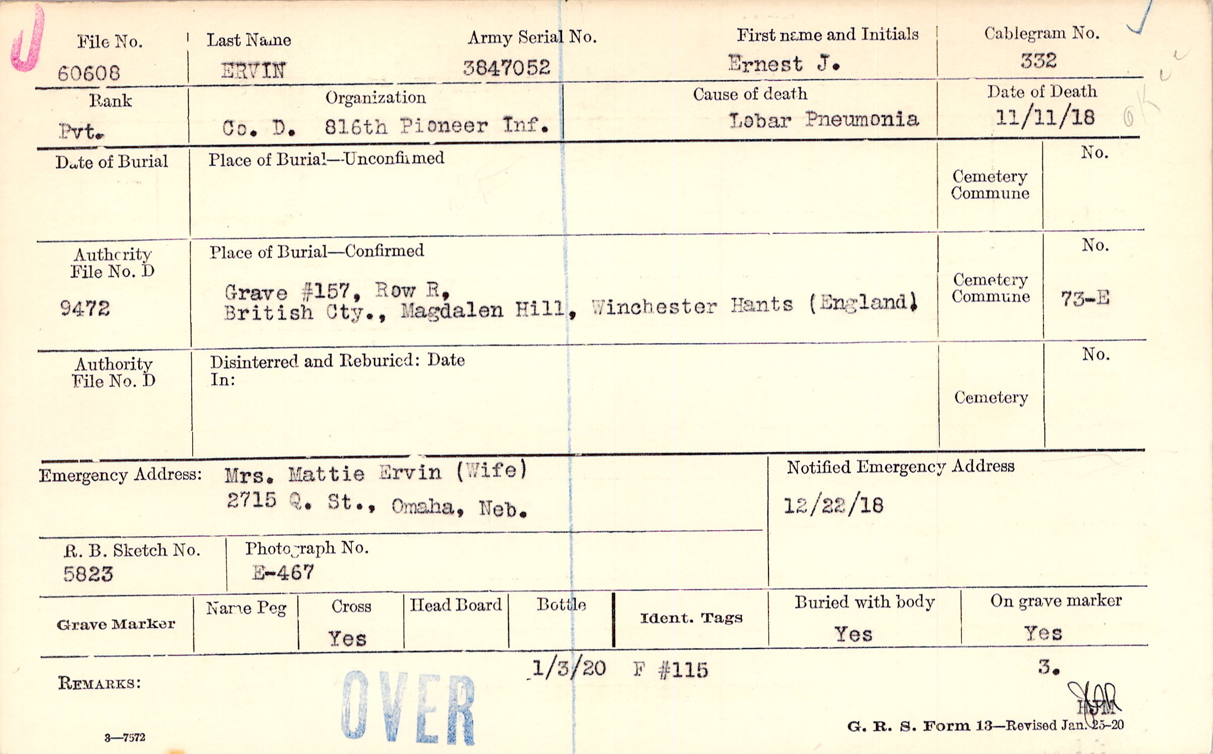 Mrs. Mattie Ervin (Wife), 2715 Q. St., Omaha, Neb.