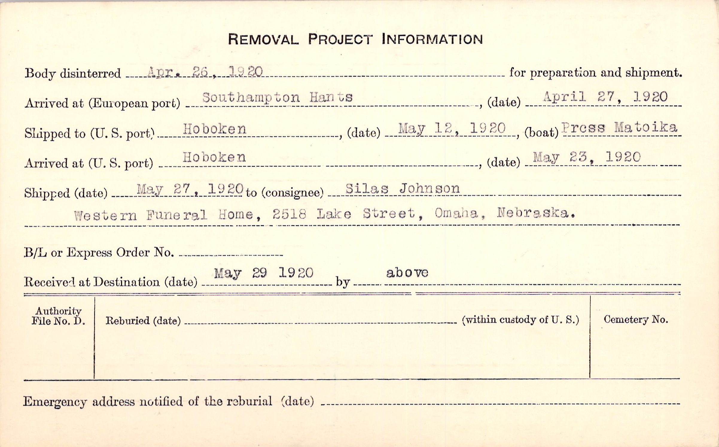 Body disinterred 4/26/1920 for preparation and shipment.