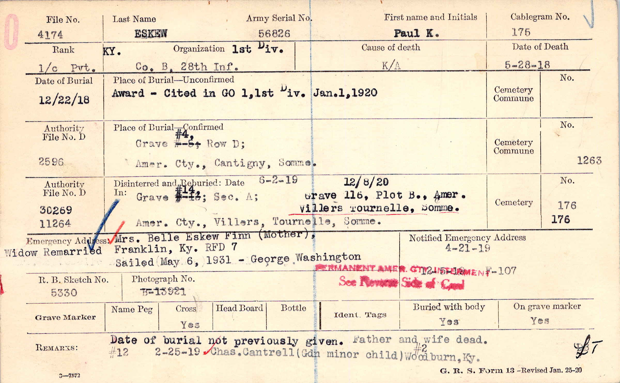 Mrs. Belle Eskew Finn (Mother),, Franklin, Ky. RFD 7, Widow Remarried Sailed May 6, 1931 - George Washington