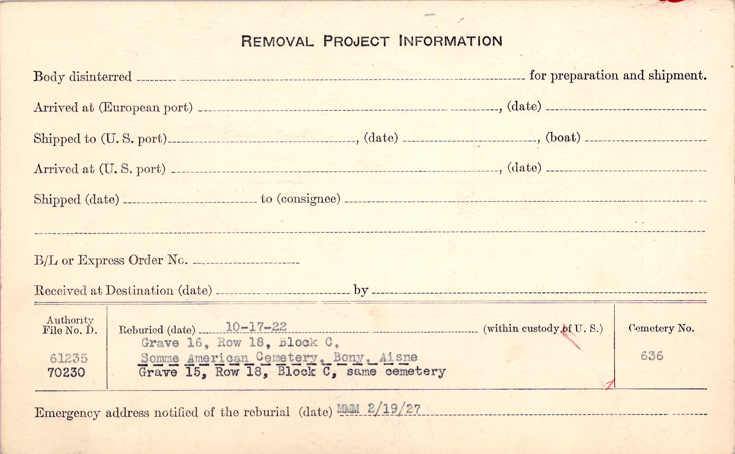 Prior Burial in Foreign Cemetery |