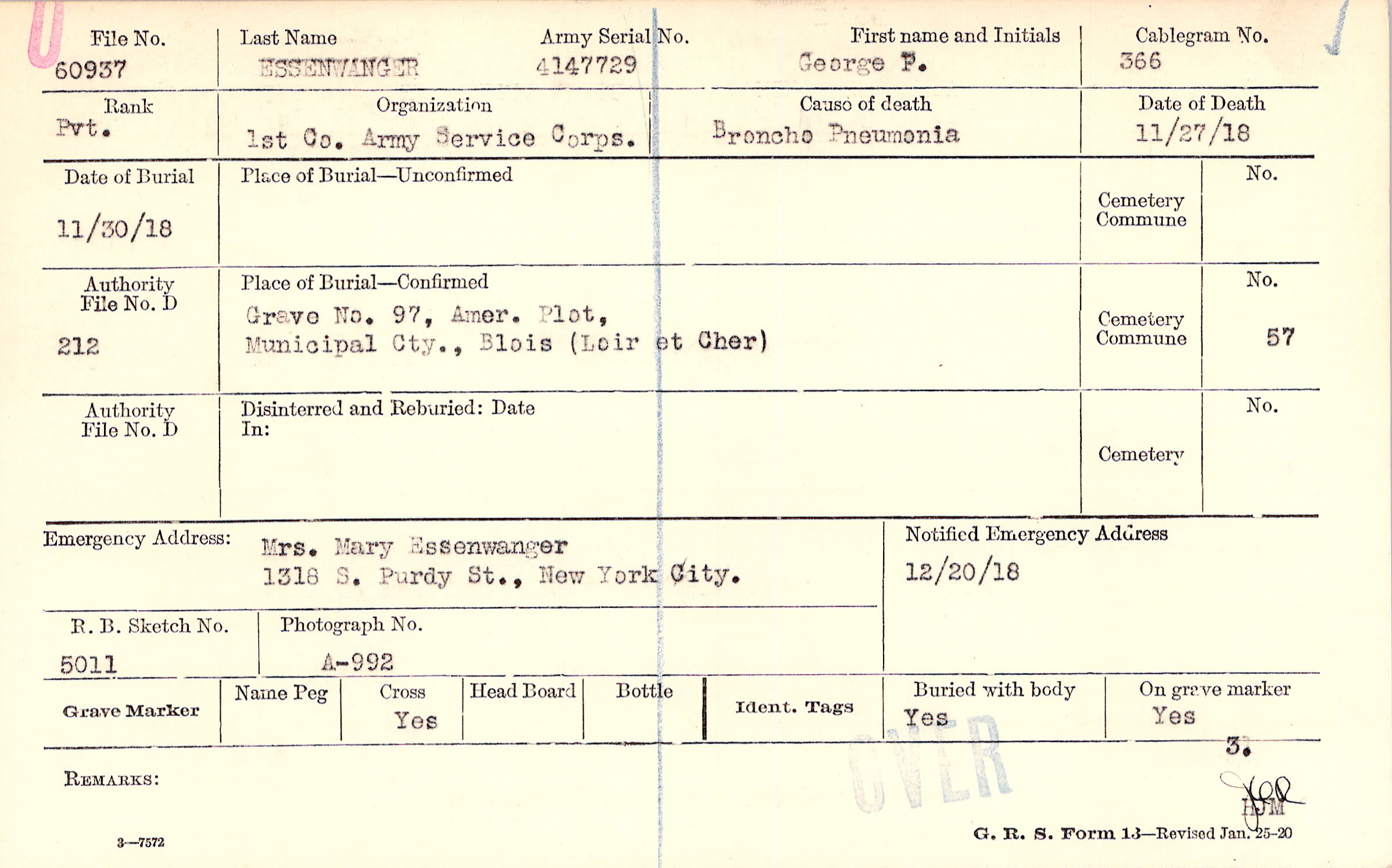 Grave NO. 97, Amer. Plot,Municipal; Cty., Blois (Loir et Cher)