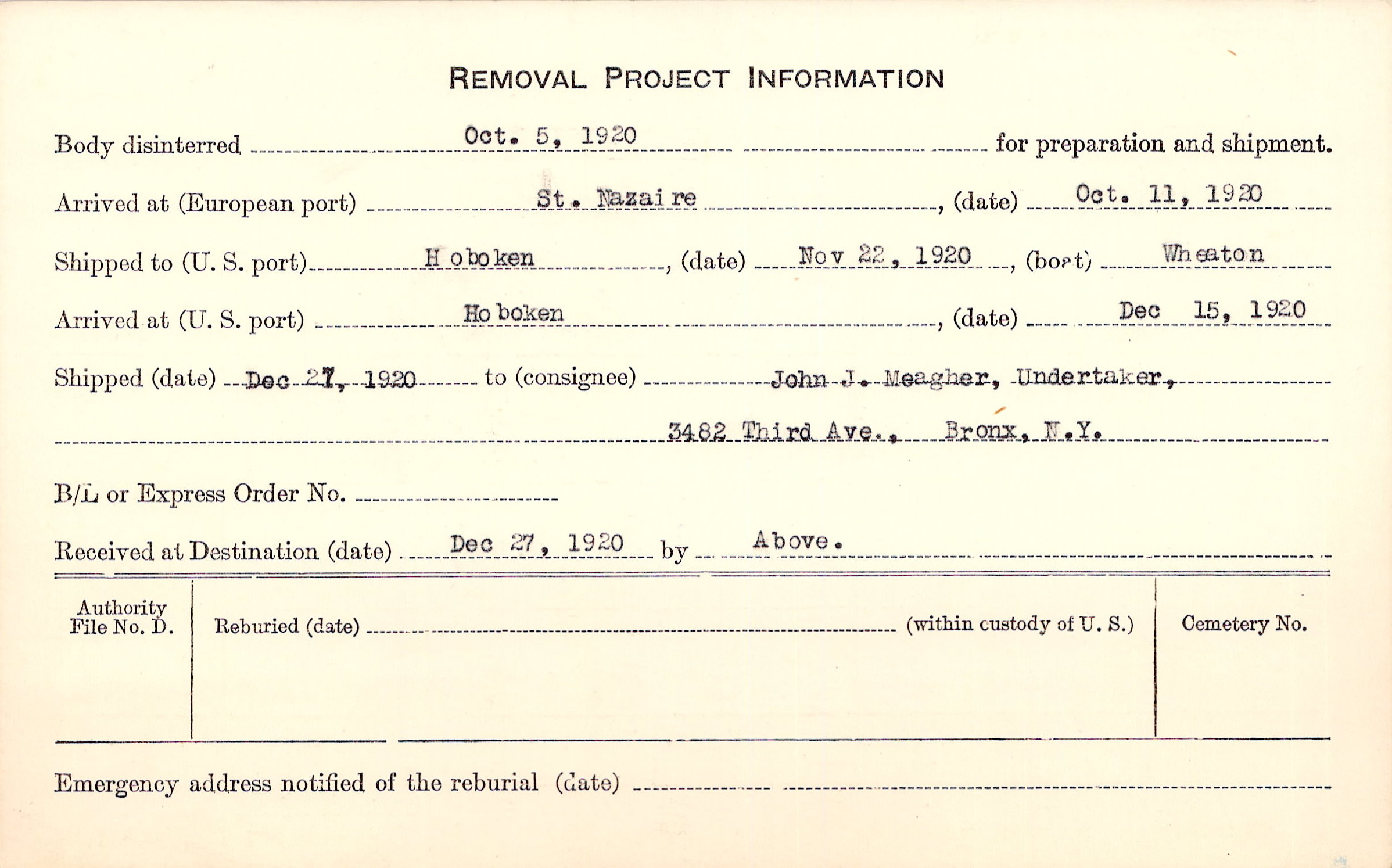Body disinterred 10/5/1920 for preparation and shipment.