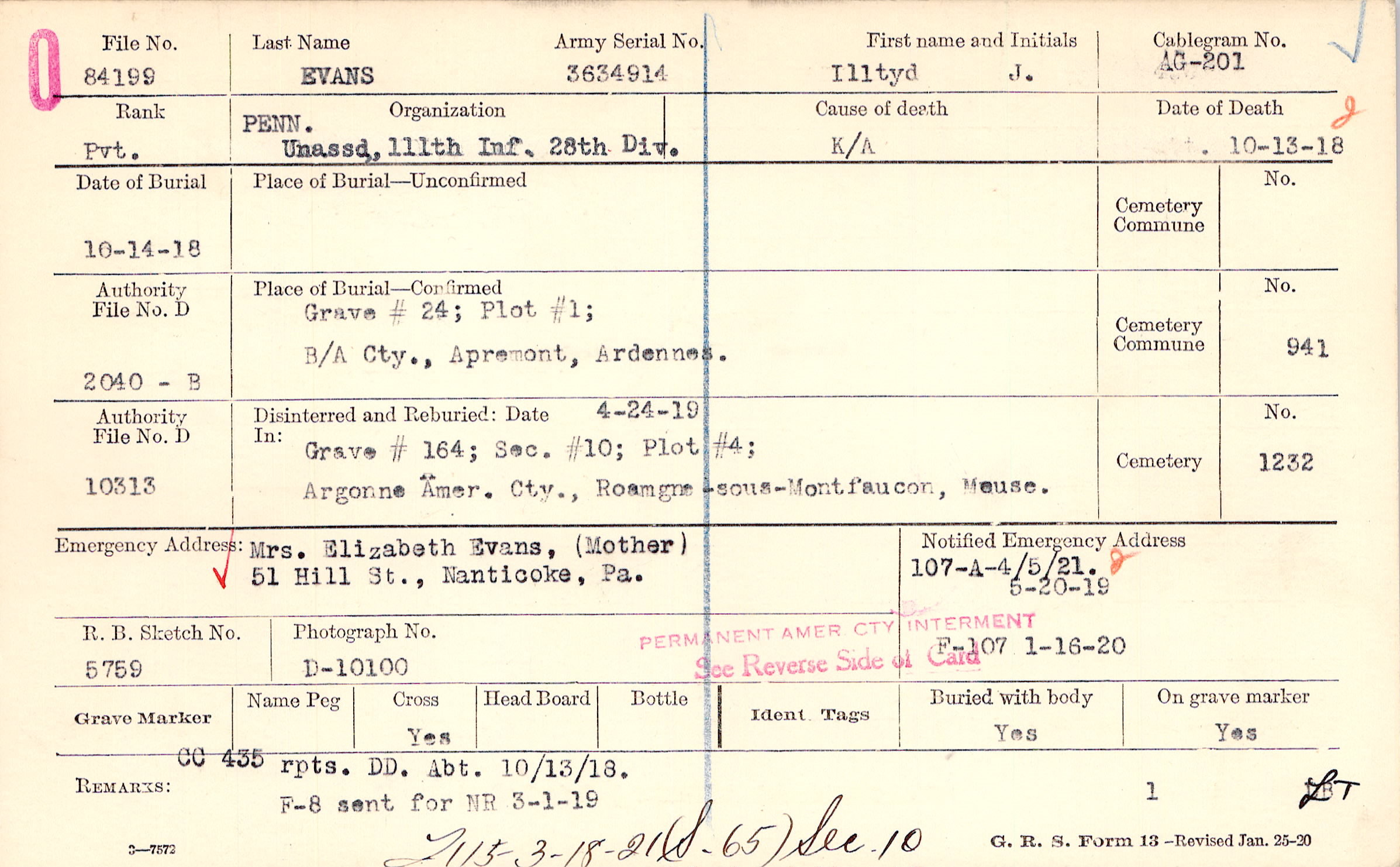 Mrs. Elizabeth Evans, (Mother), 51 Hill St., Nanticoke, Pa.