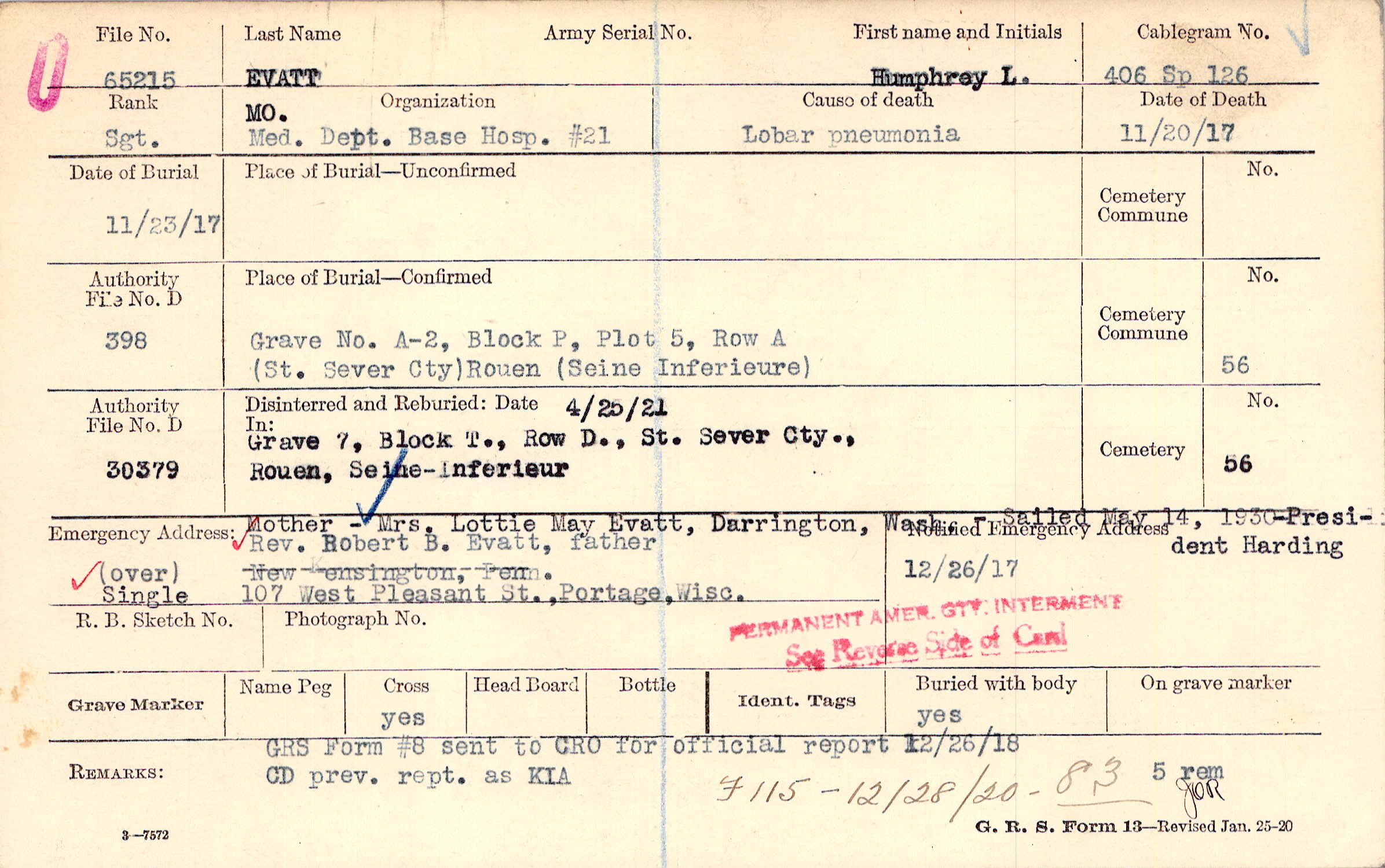 Grave A-2, Block P, Plot 5, Row A, St. Sever Cty., Rouen, Seine Inferieure