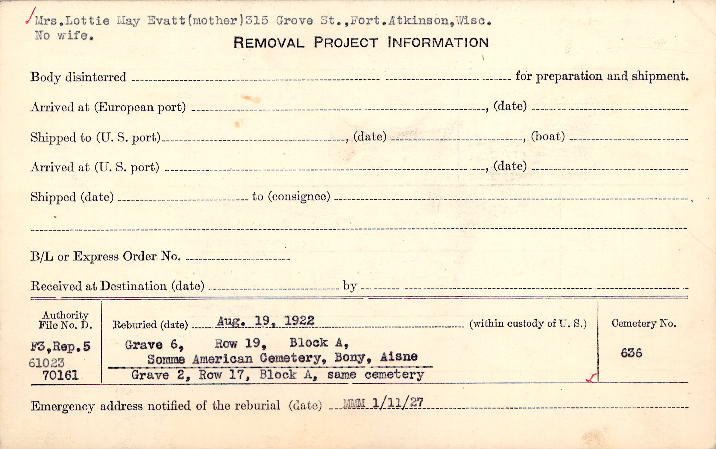 Mrs. Lottie May Evatt (mother), 315 Grove St., Fort. Atkinson, Wisc. No wife |