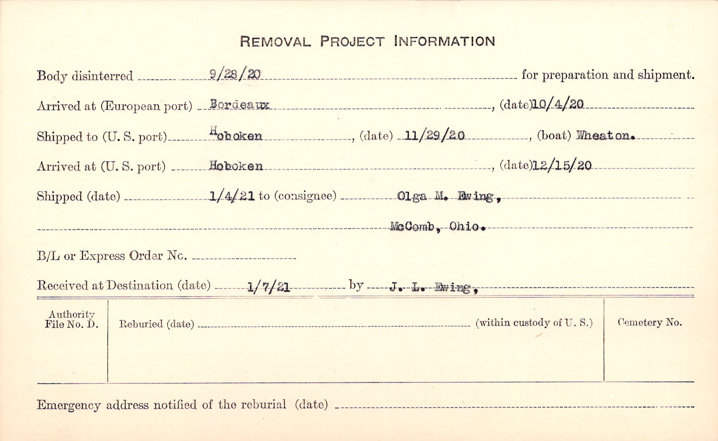 Body disinterred 9/28/1920 for preparation and shipment.