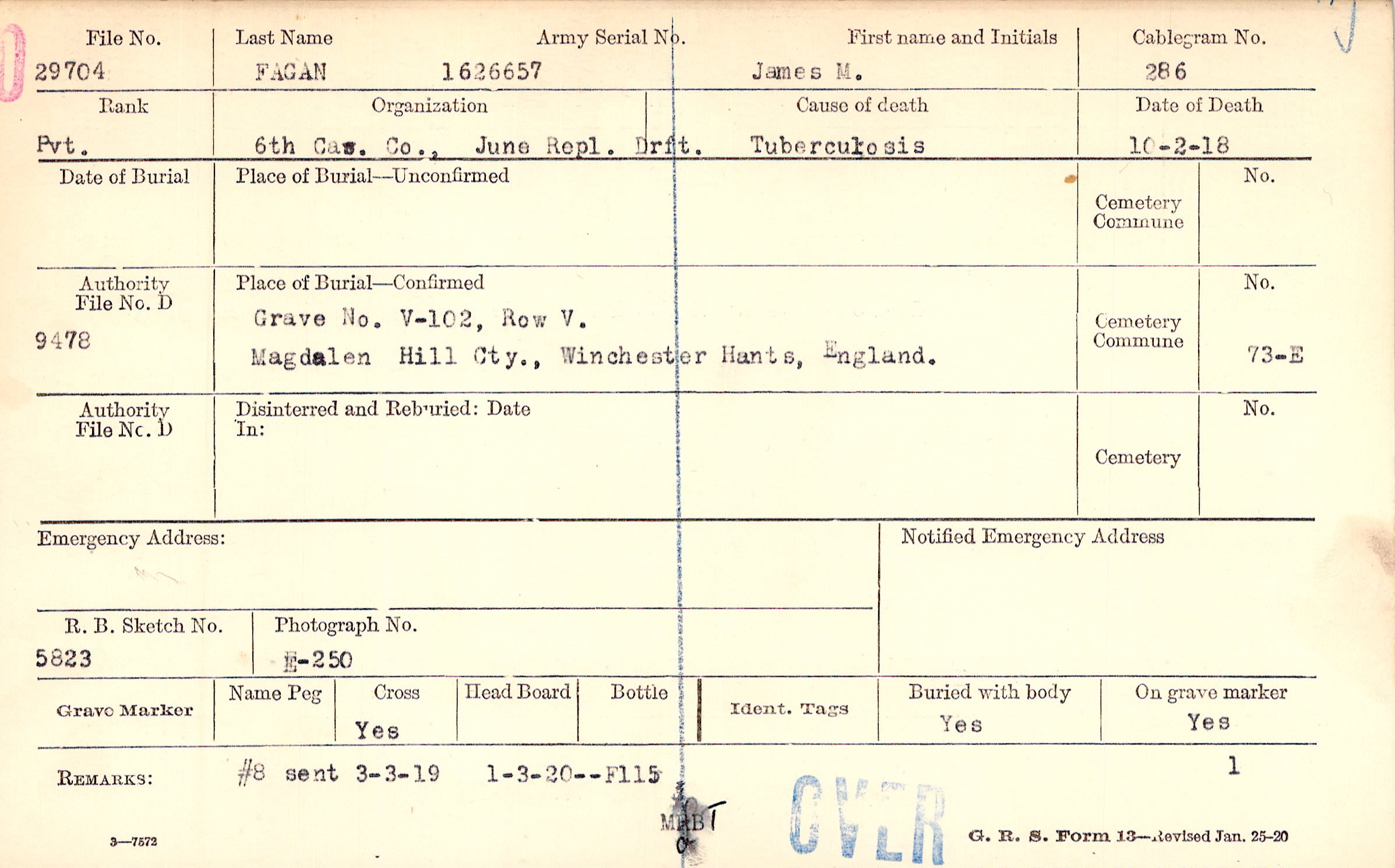 Grave V-102, Row V., Magdalen Hill Cty., Winchester Hants, England.