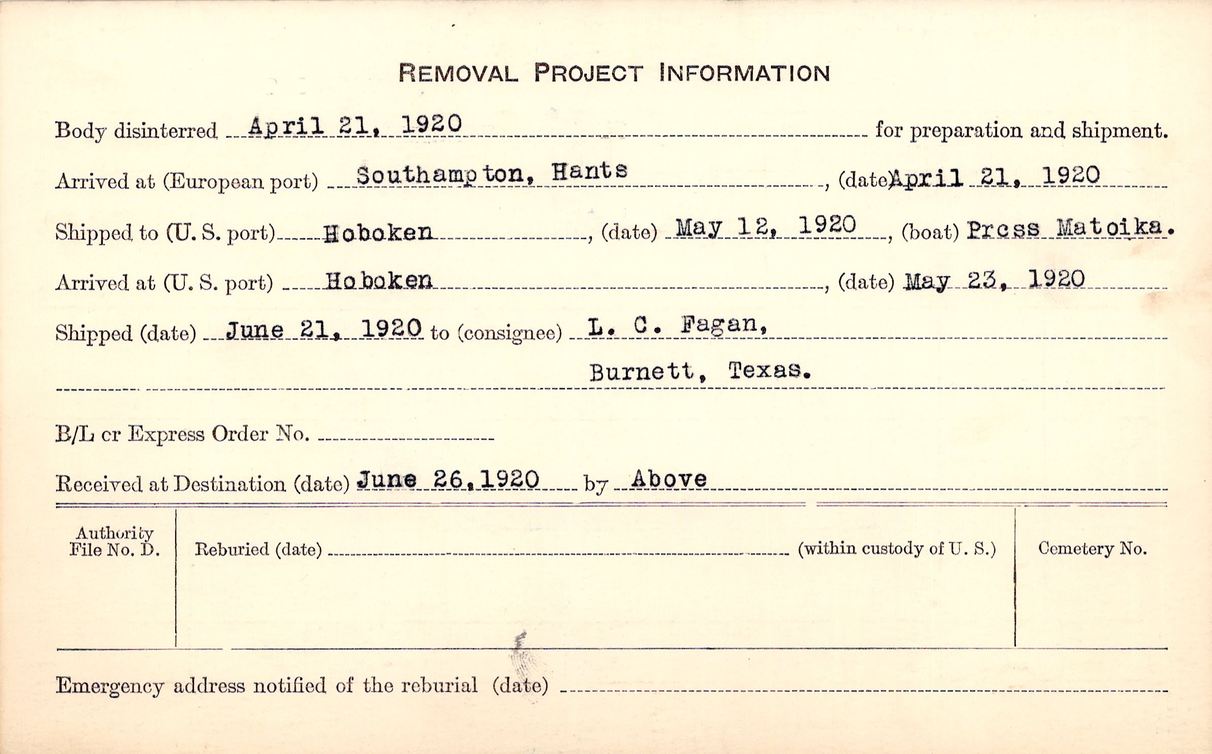 Body disinterred 4/21/1920 for preparation and shipment.
