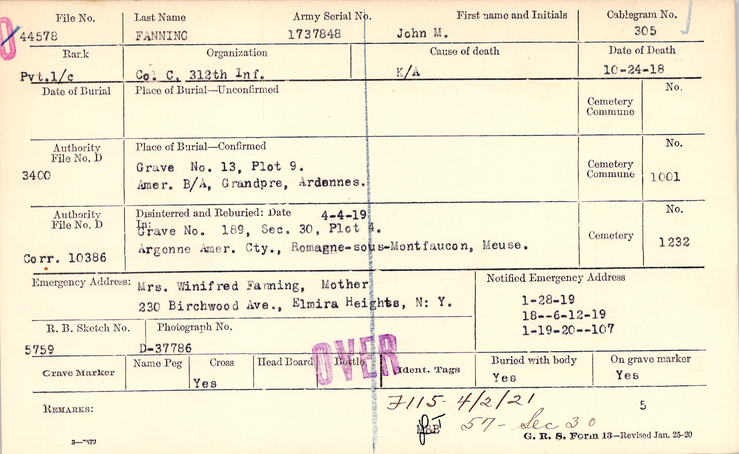 Mrs. Winifred Fanning, Mother, 230 Birchwood Ave., Elmira Heights, N : Y.