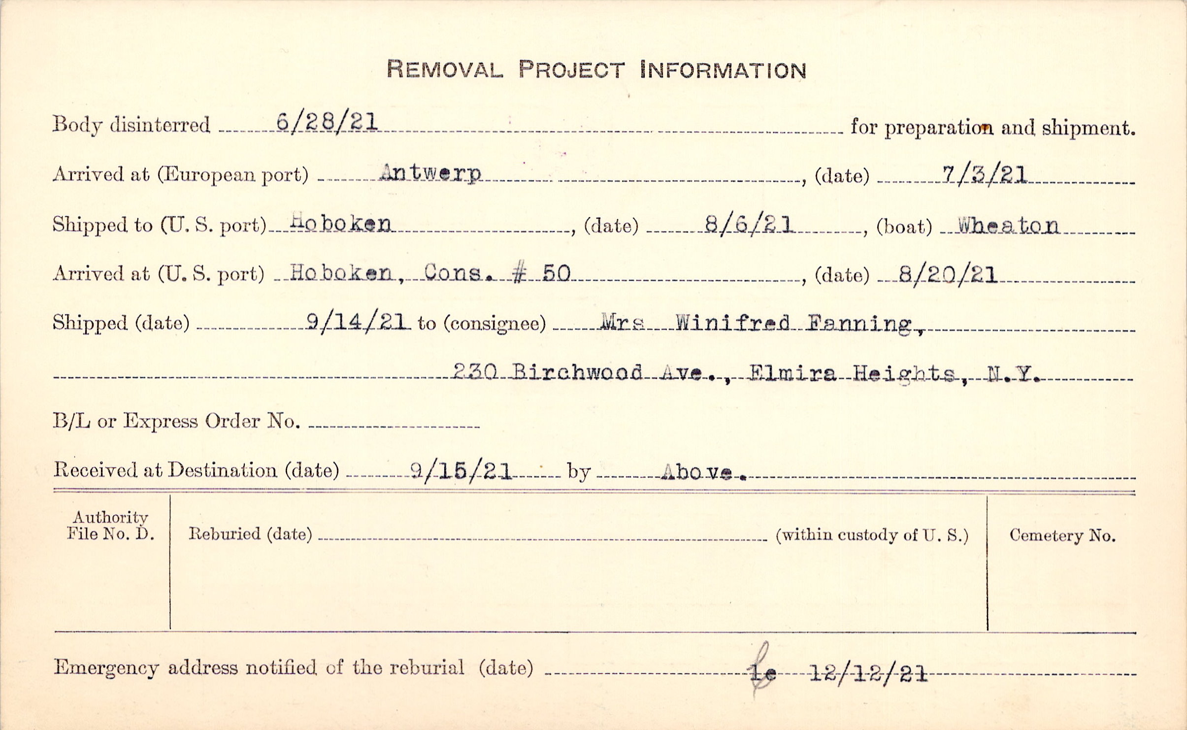 Body disinterred 6/28/1921 for preparation and shipment.