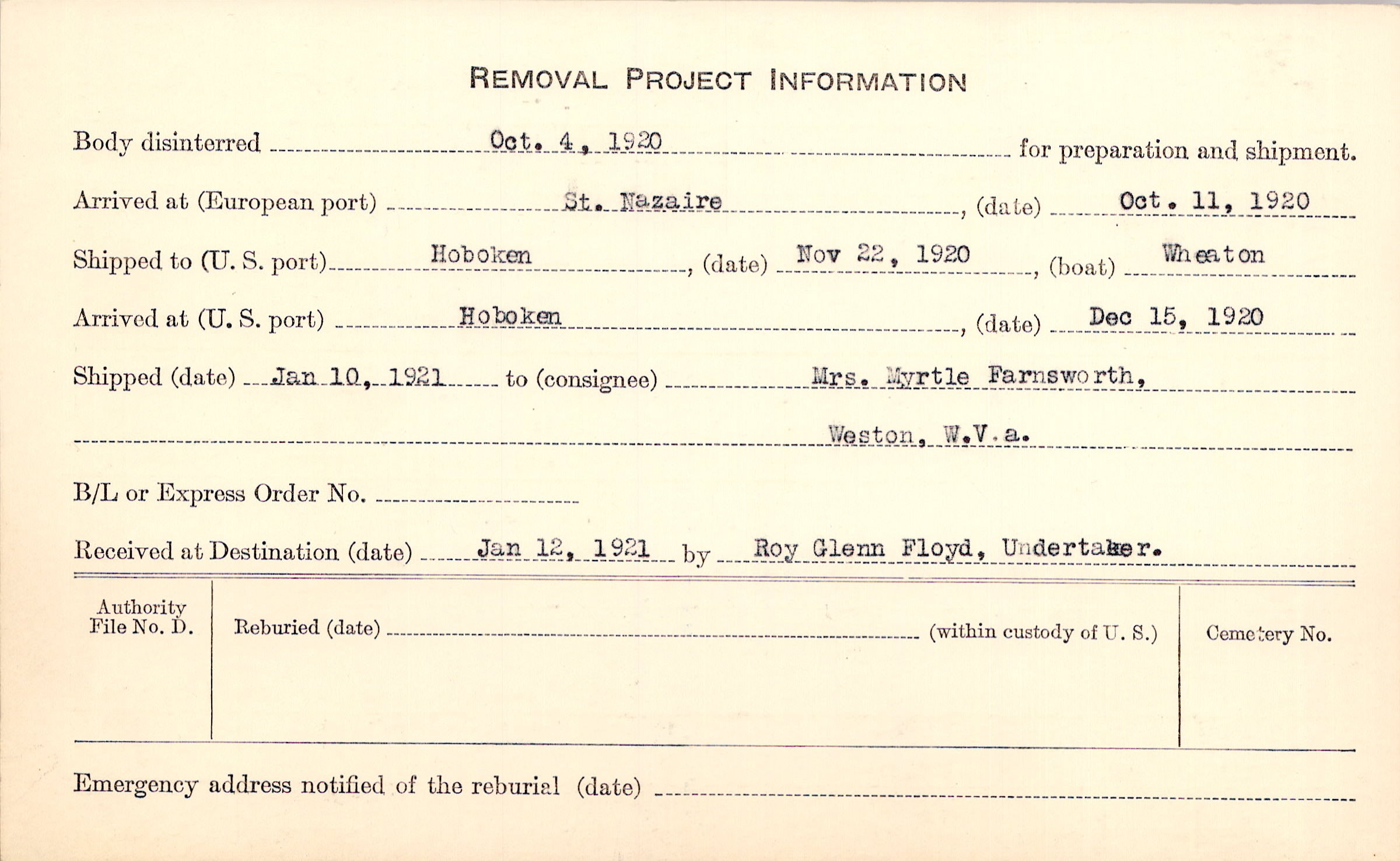 Body disinterred 10/4/1920 for preparation and shipment.