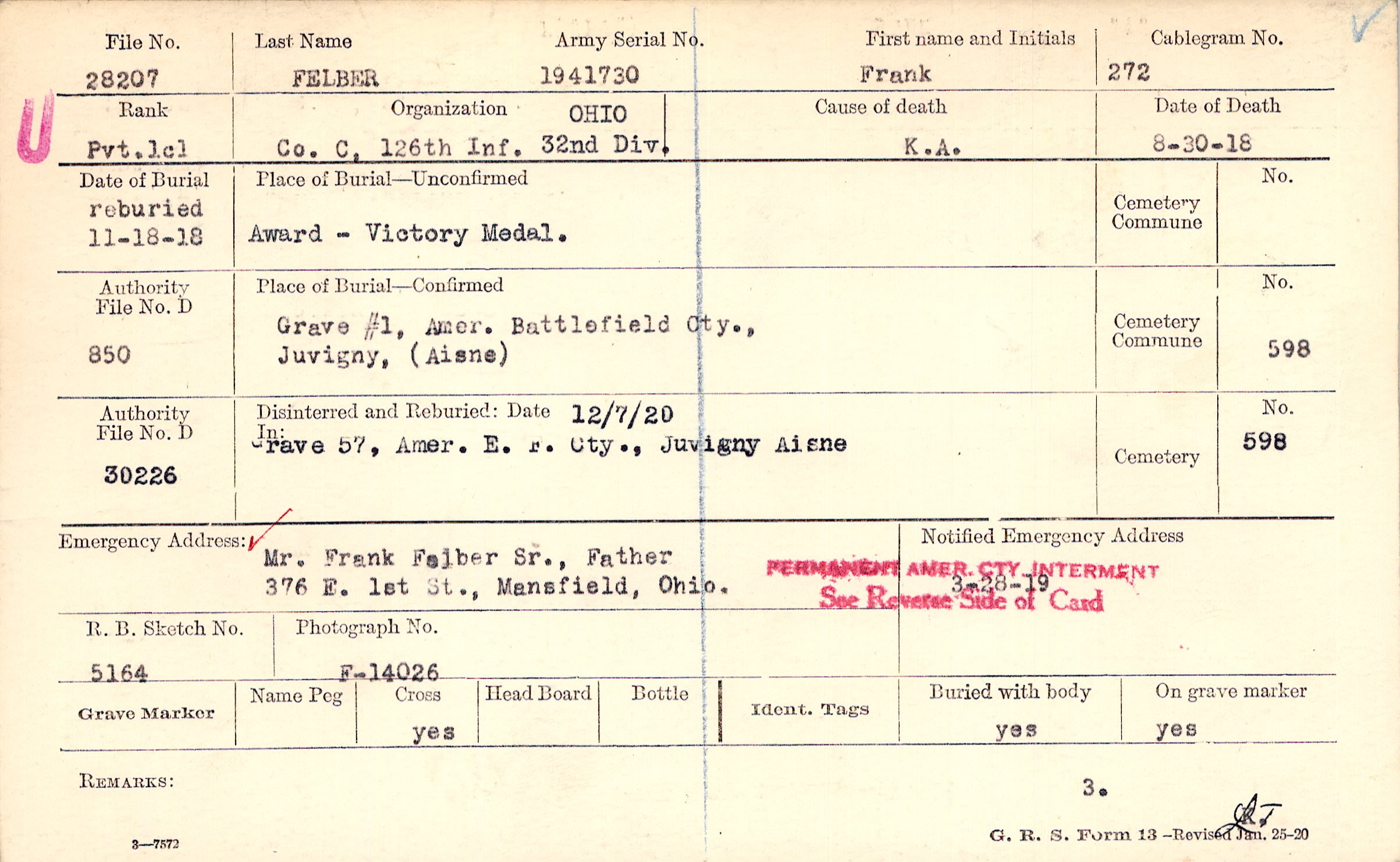 Mr. Frank Felber Sr. , Father, 376 E. 1st St . , Mansfield, Ohio.