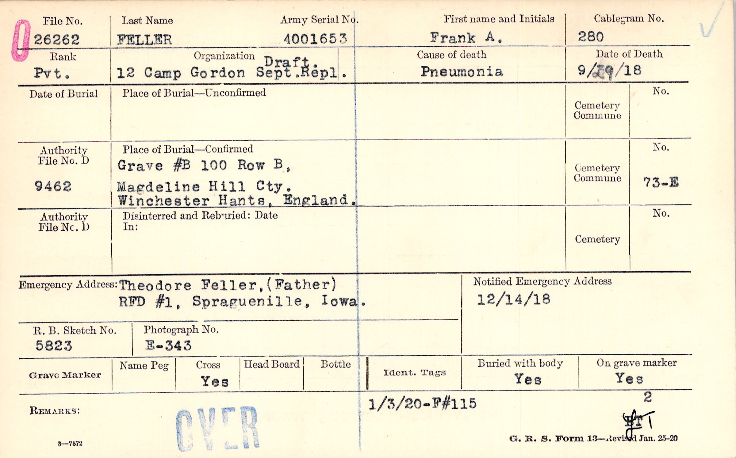 Grave #B 100, Row B, Magdeline Hill Cty., Winchester Hants, England.