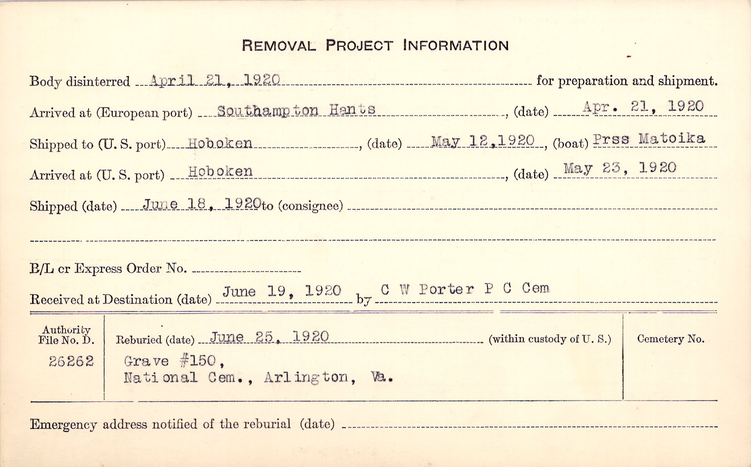 Body disinterred 4/21/1920 for preparation and shipment.