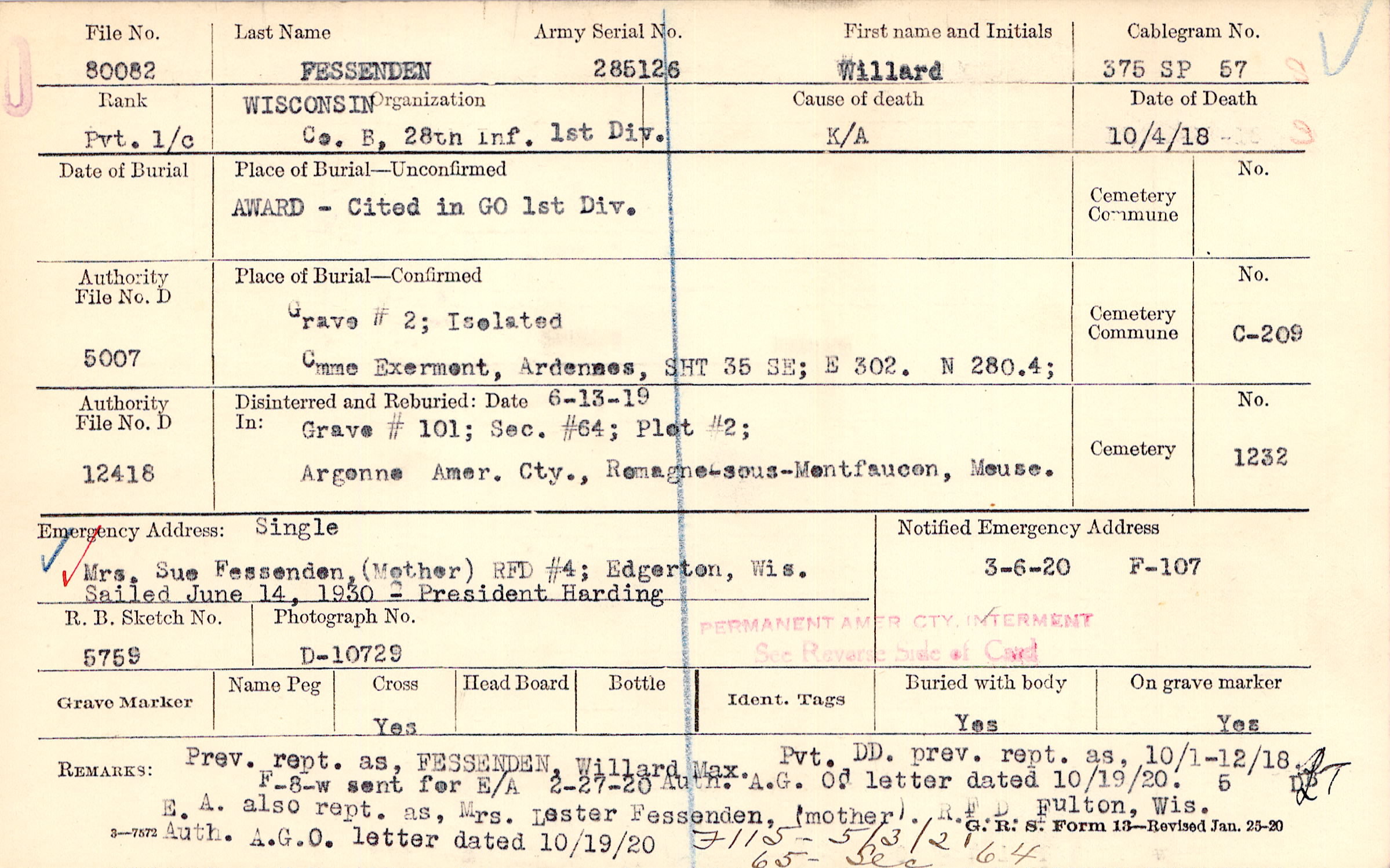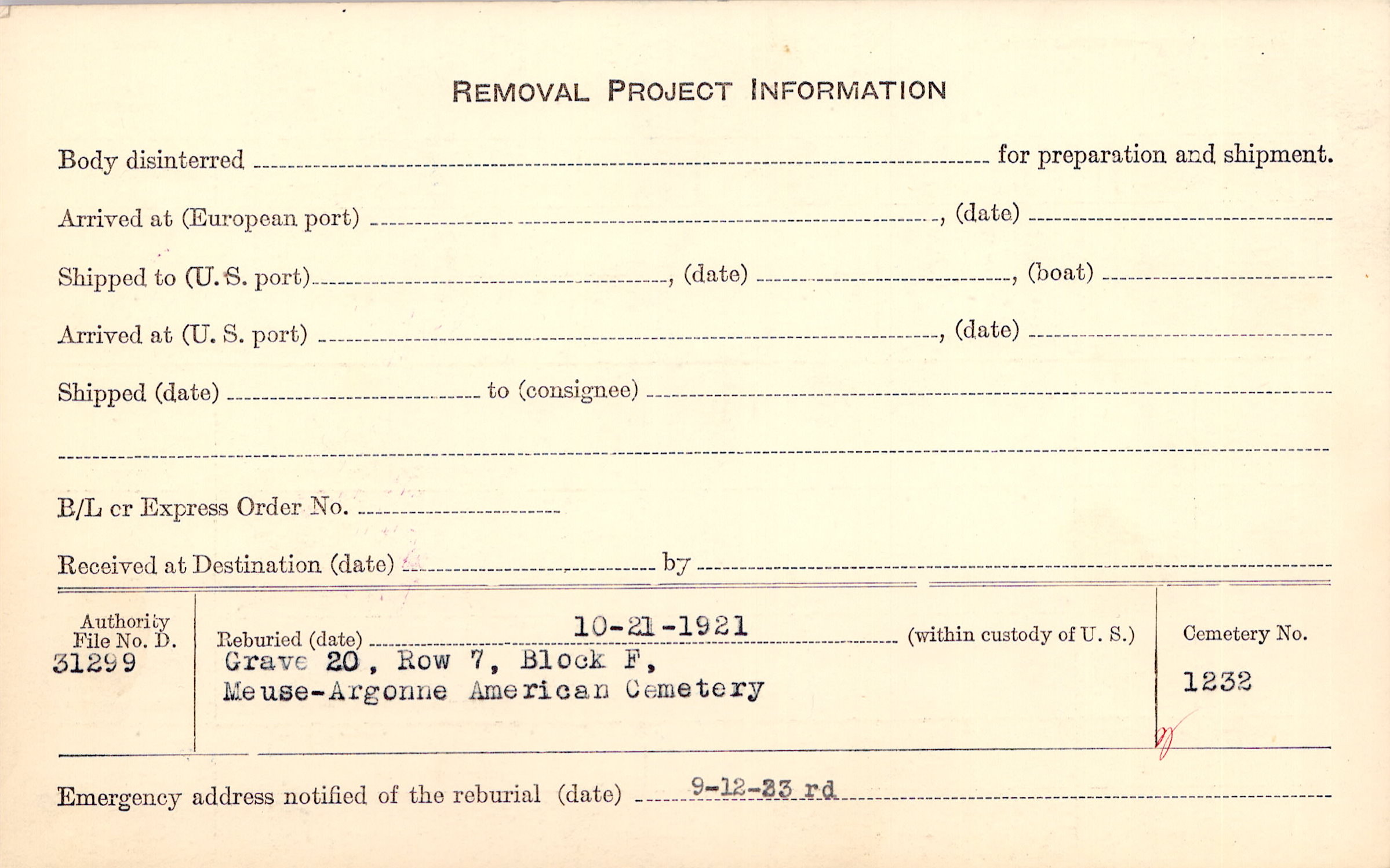 Grave 101, Section 64, Plot 2, Argonne American Cemetery, Romagne-sous-Montfaucon, Meuse