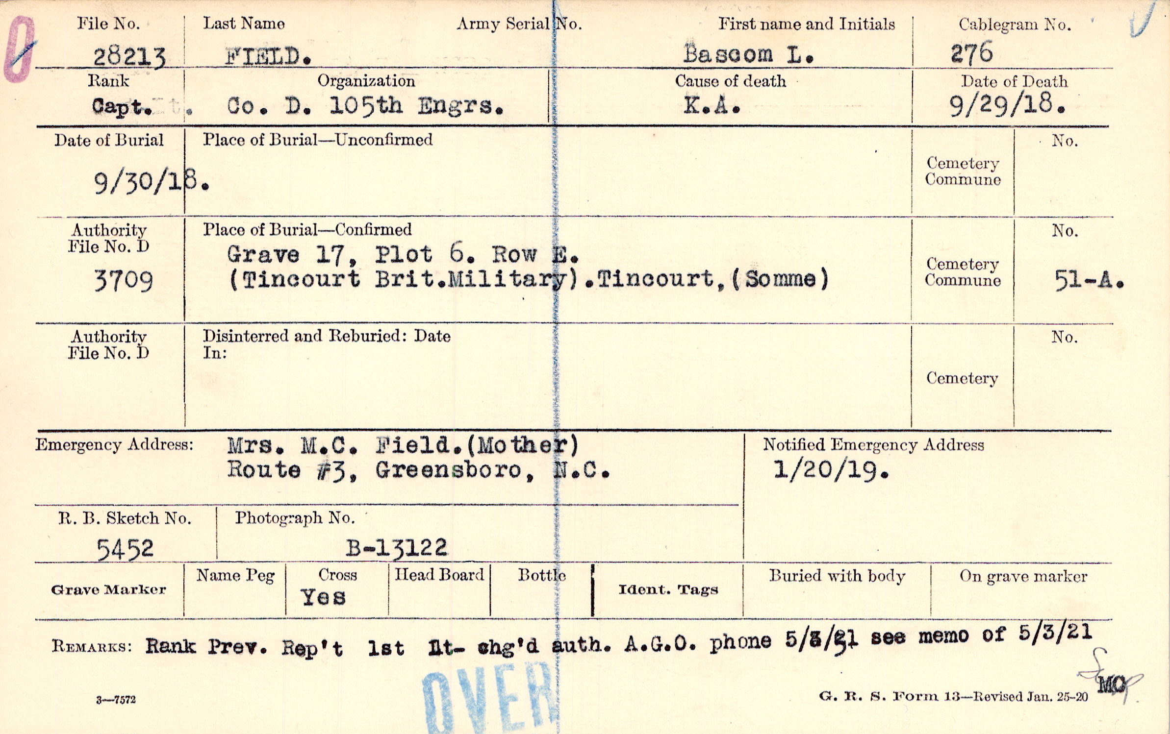 Rank Prev. Rep't 1st Lt- chg'd auth. A.G.O. phone 5/3/21 see memo of 5/3/21