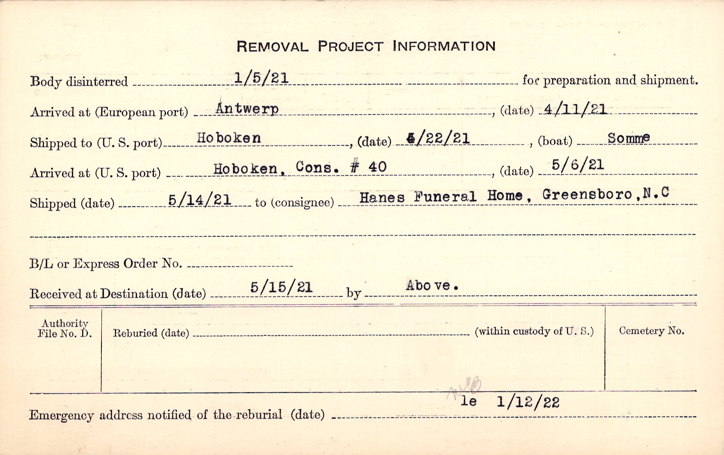 Body disinterred 1/5/1921 for preparation and shipment.