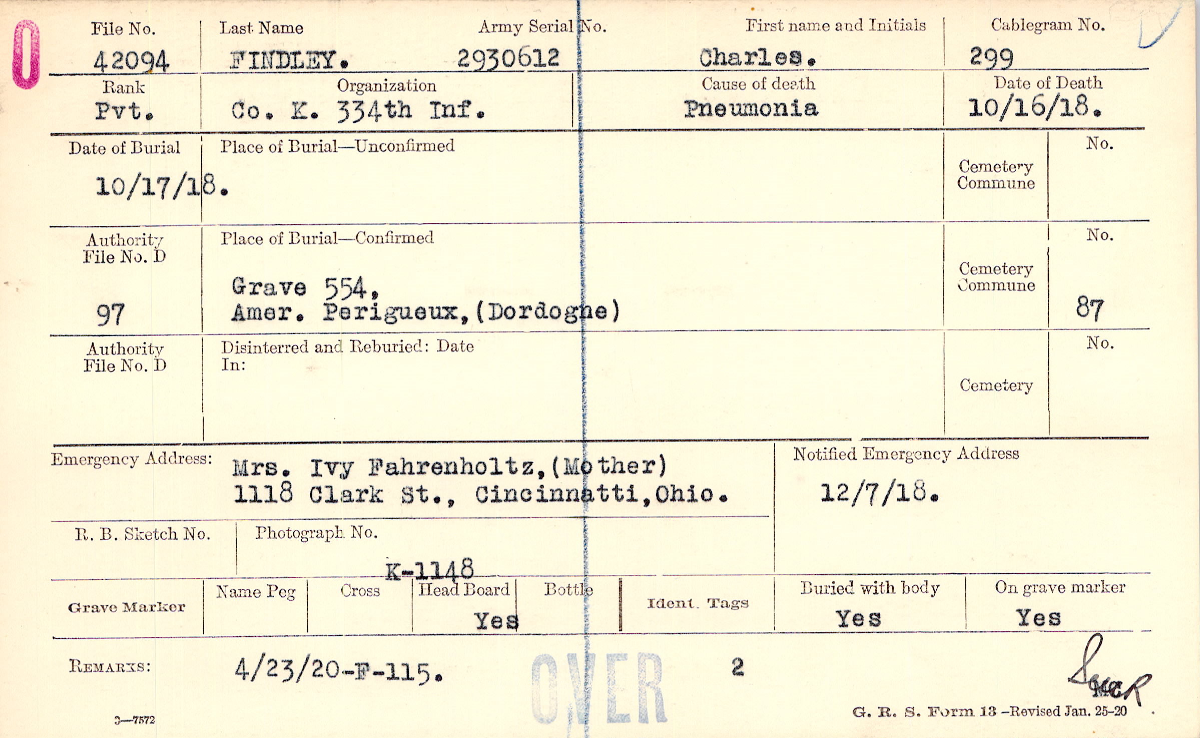 Mrs. Ivy Fahrenholtz, (Mother), 1118 Clark St., Cincinnatti, Ohio.