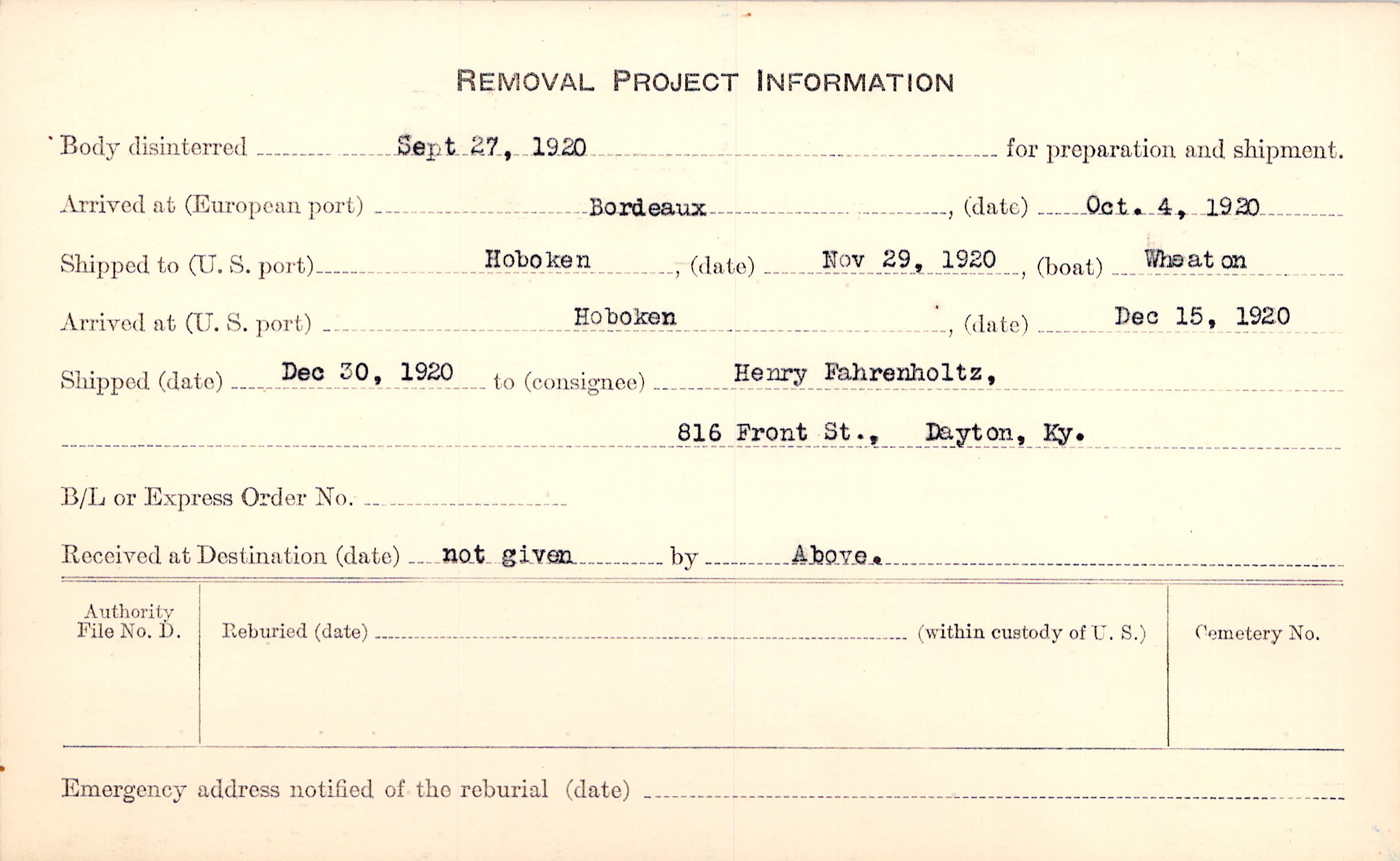 Body disinterred 9/27/1920 for preparation and shipment.