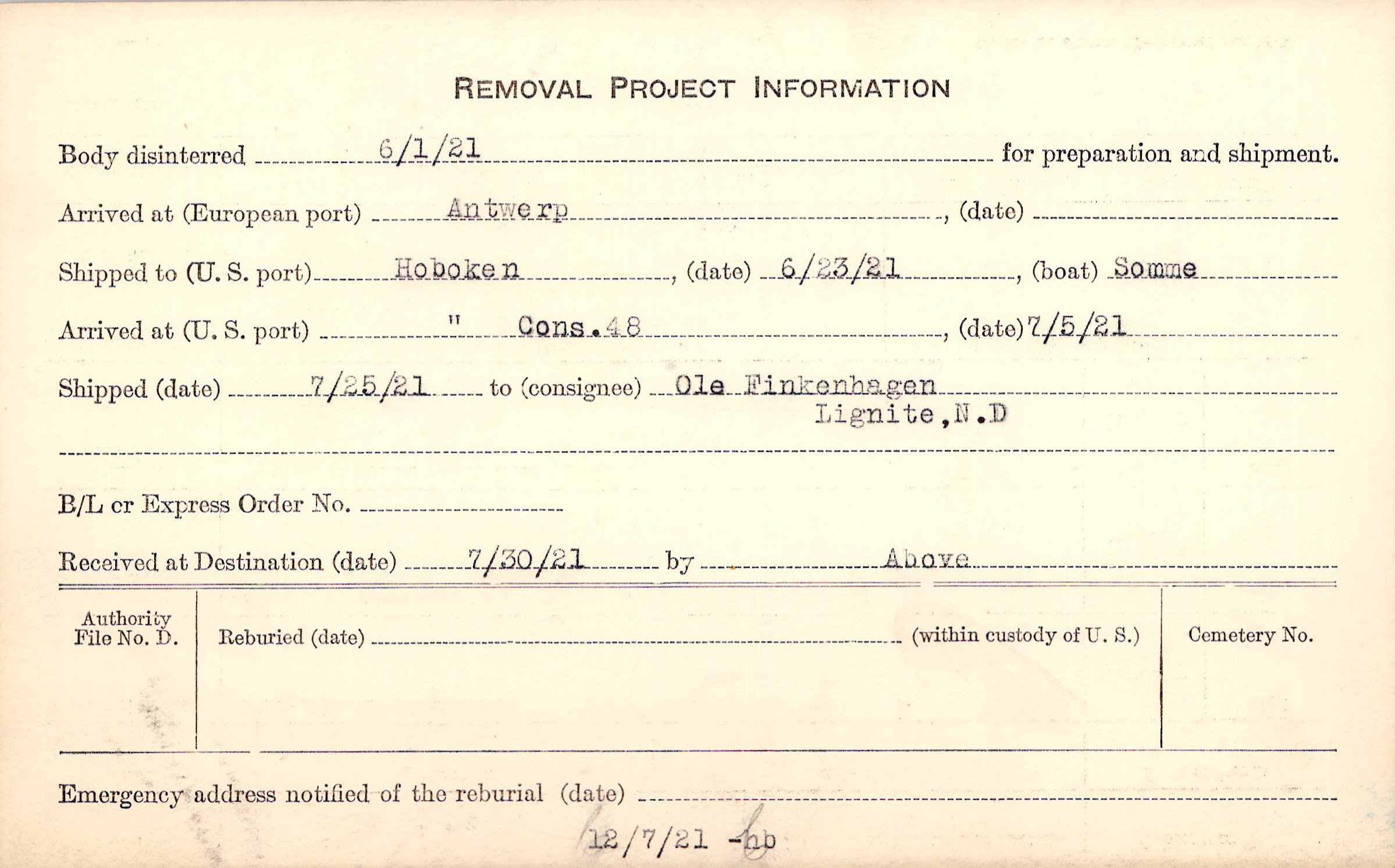 Body disinterred 6/1/1921 for preparation and shipment.