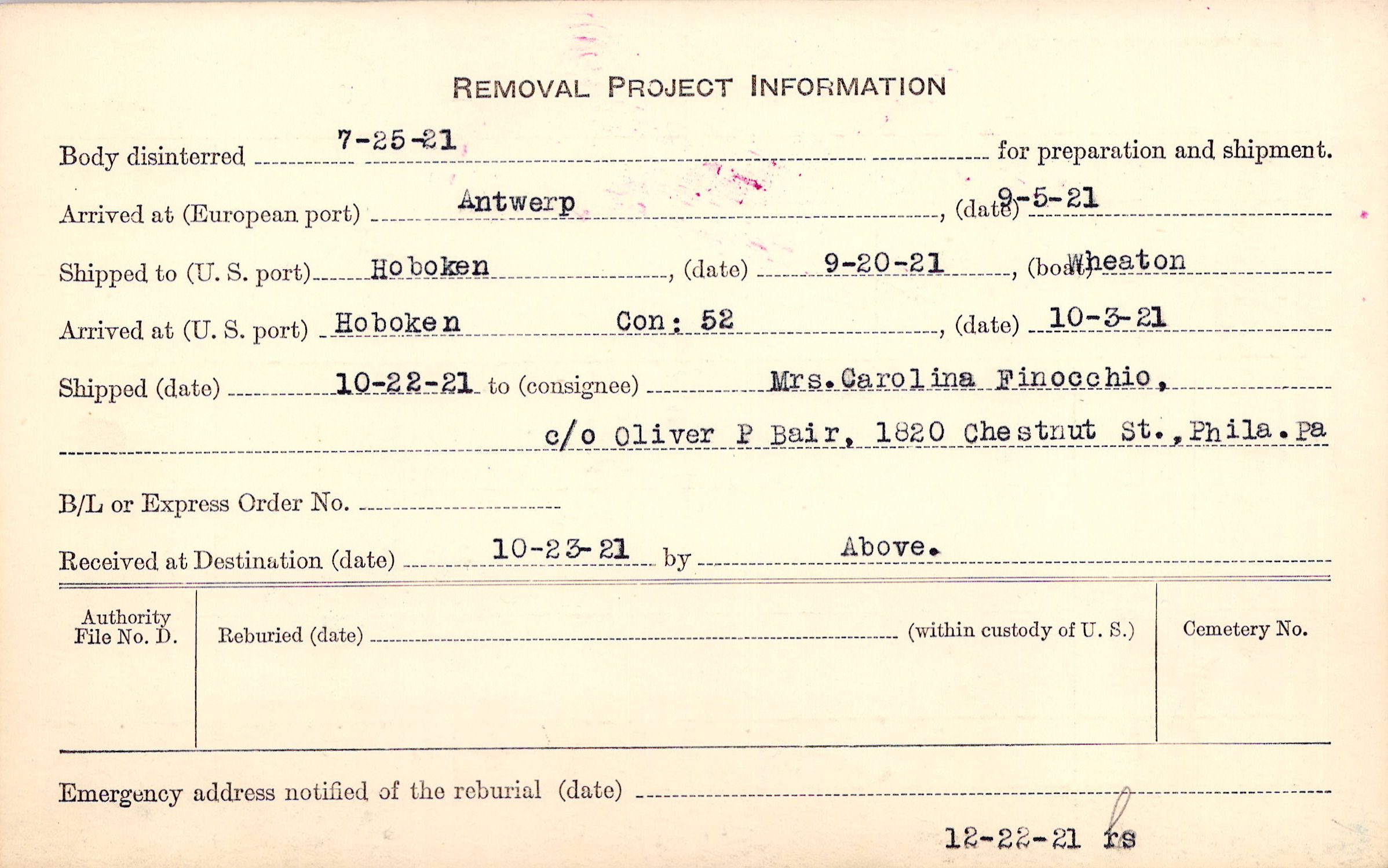 Body disinterred 7/25/1921 for preparation and shipment.