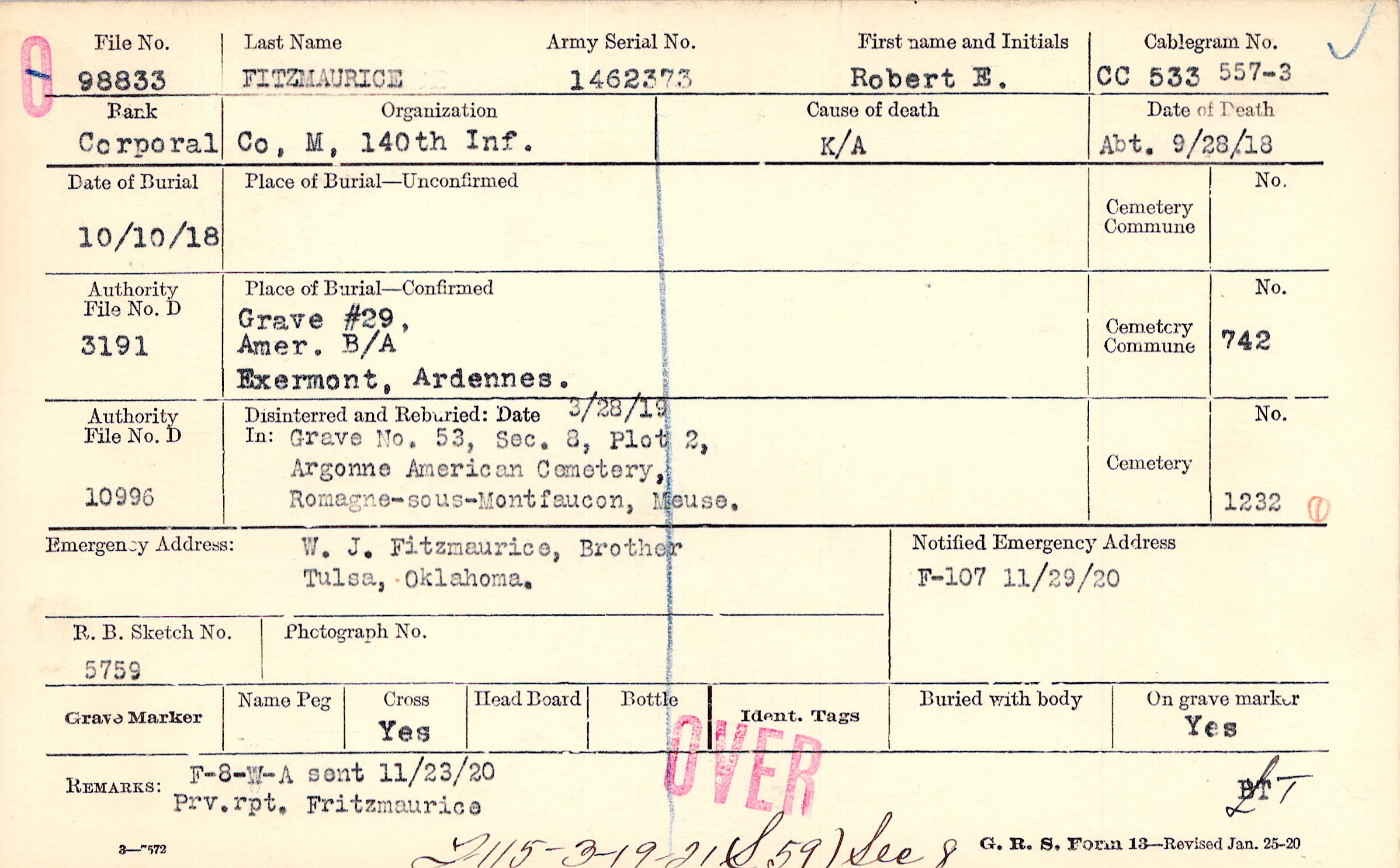 Grave #29, Amer. B/A Exermont, Ardennes.