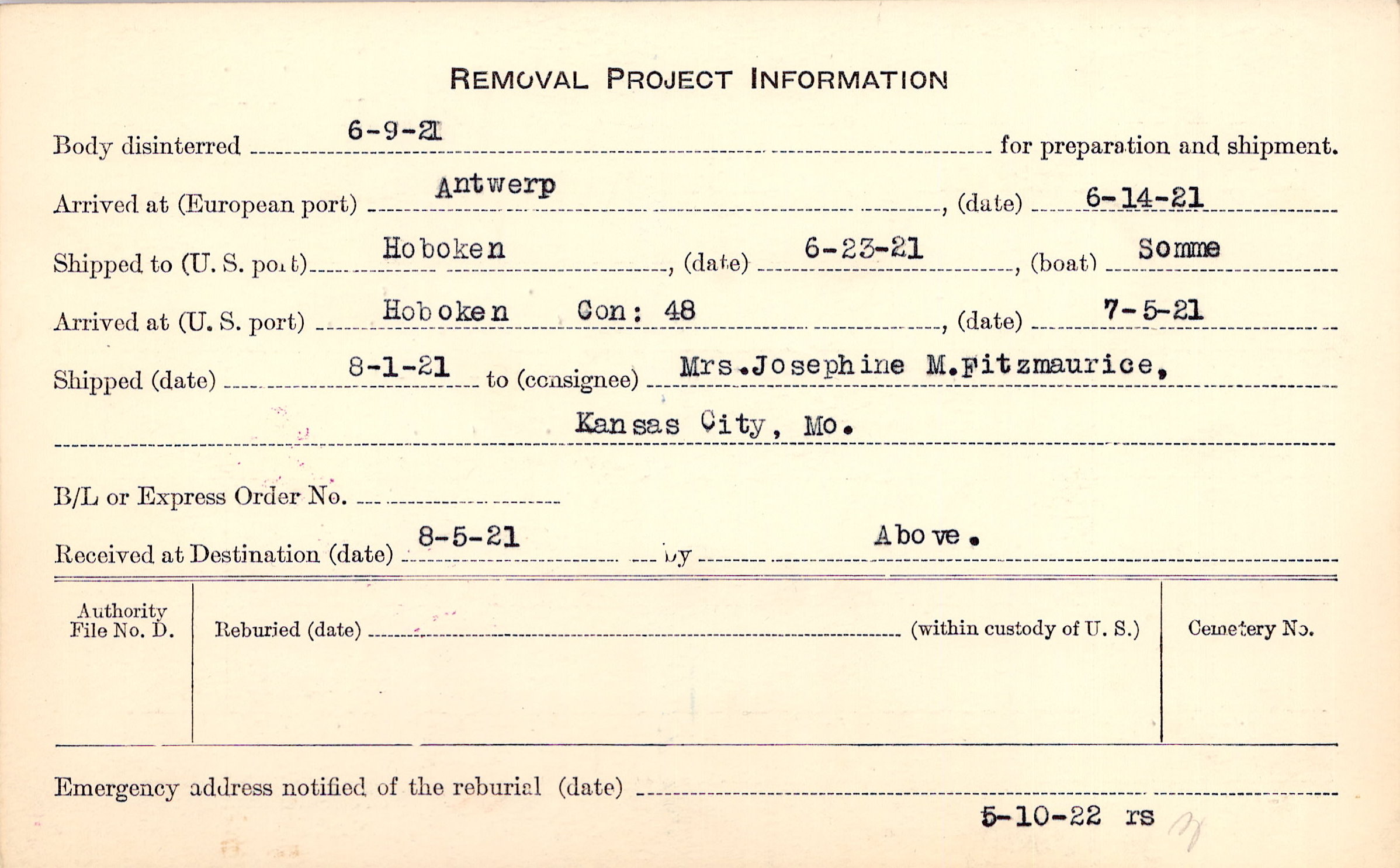 Body disinterred 6/9/1921 for preparation and shipment.