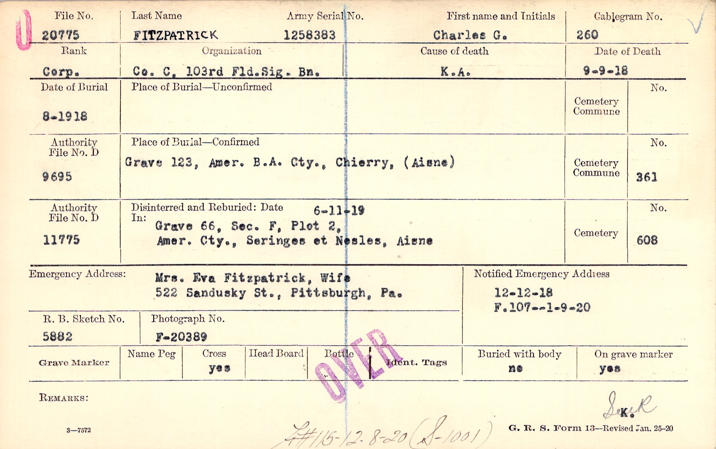 Grave 123, Amer. B/A Cty., Chierry, Aisne