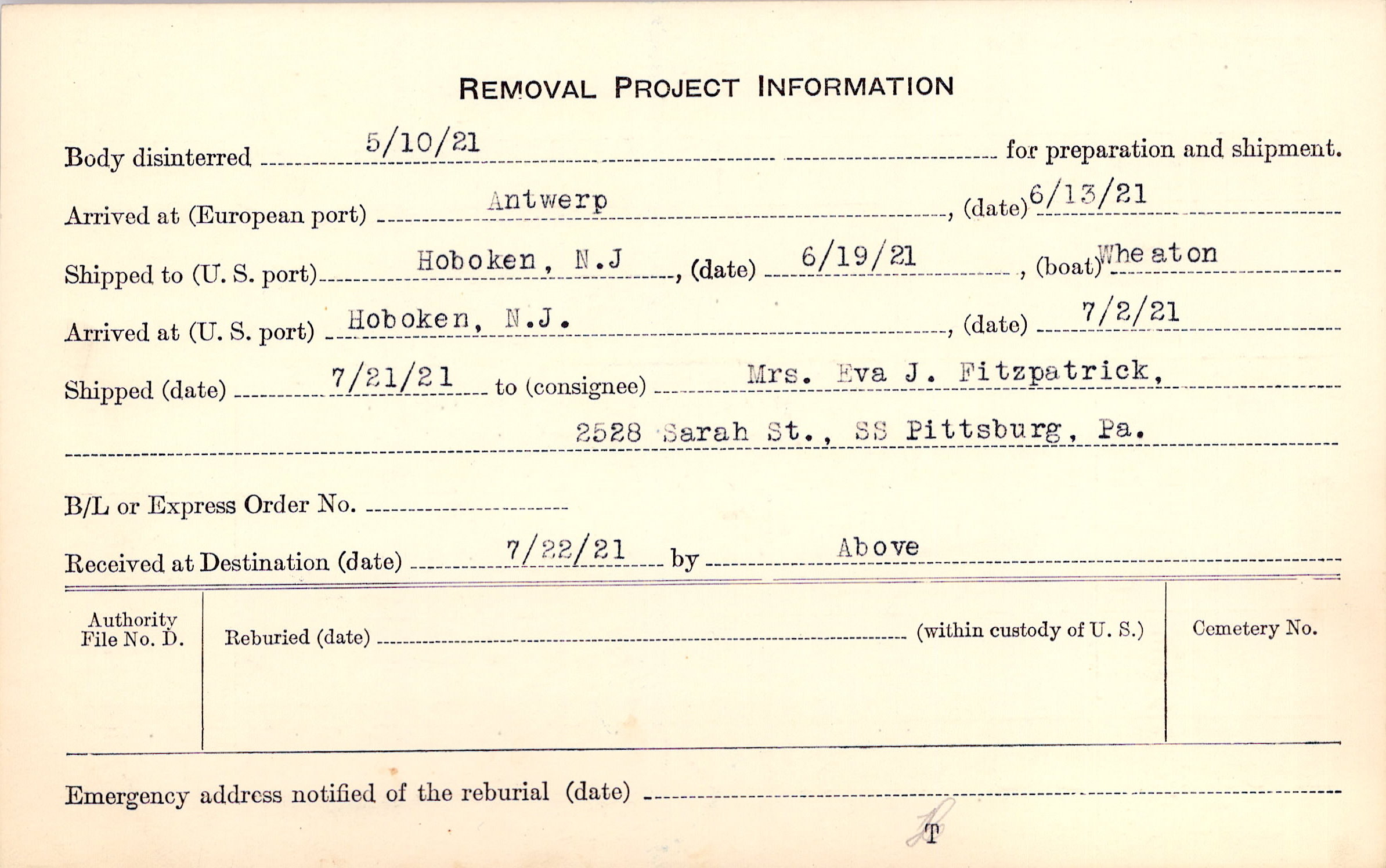 Body disinterred 5/10/1921 for preparation and shipment.