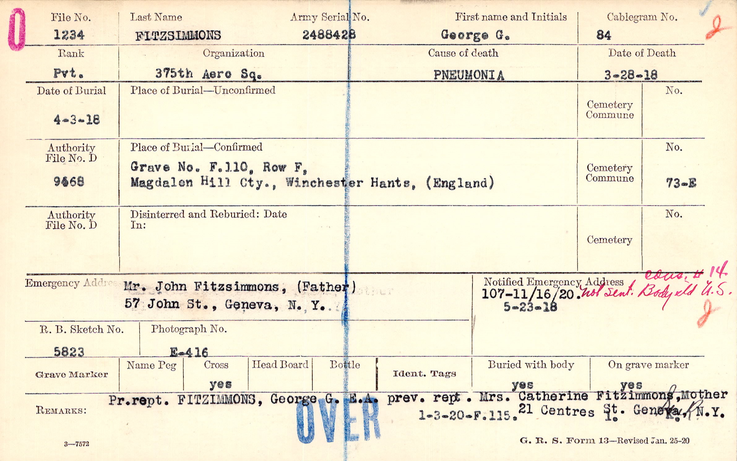 Pr. rept. FITZIMMONS, George G. E.A. prev. rept. Mrs. Catherine Fitzimmons, Mother, 21 Centres St., Geneva, N.Y., 1-3-20-F.115.