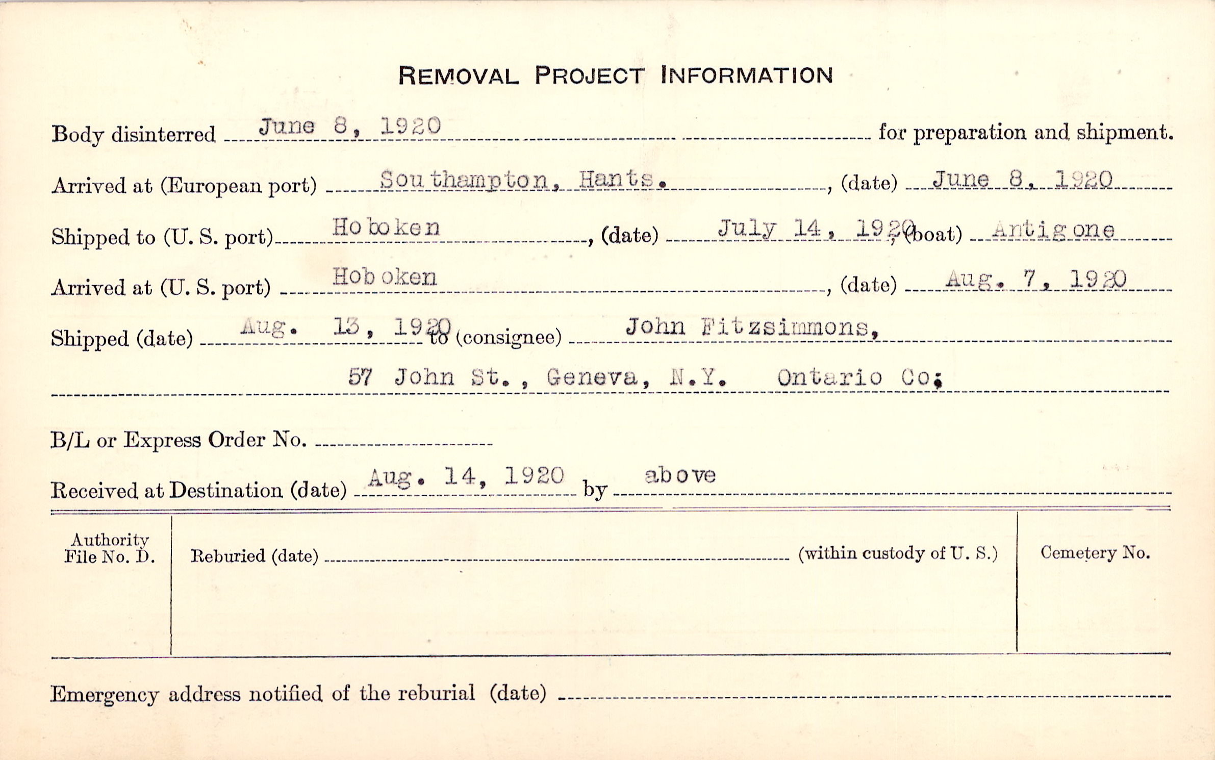 Body disinterred 6/8/1920 for preparation and shipment.
