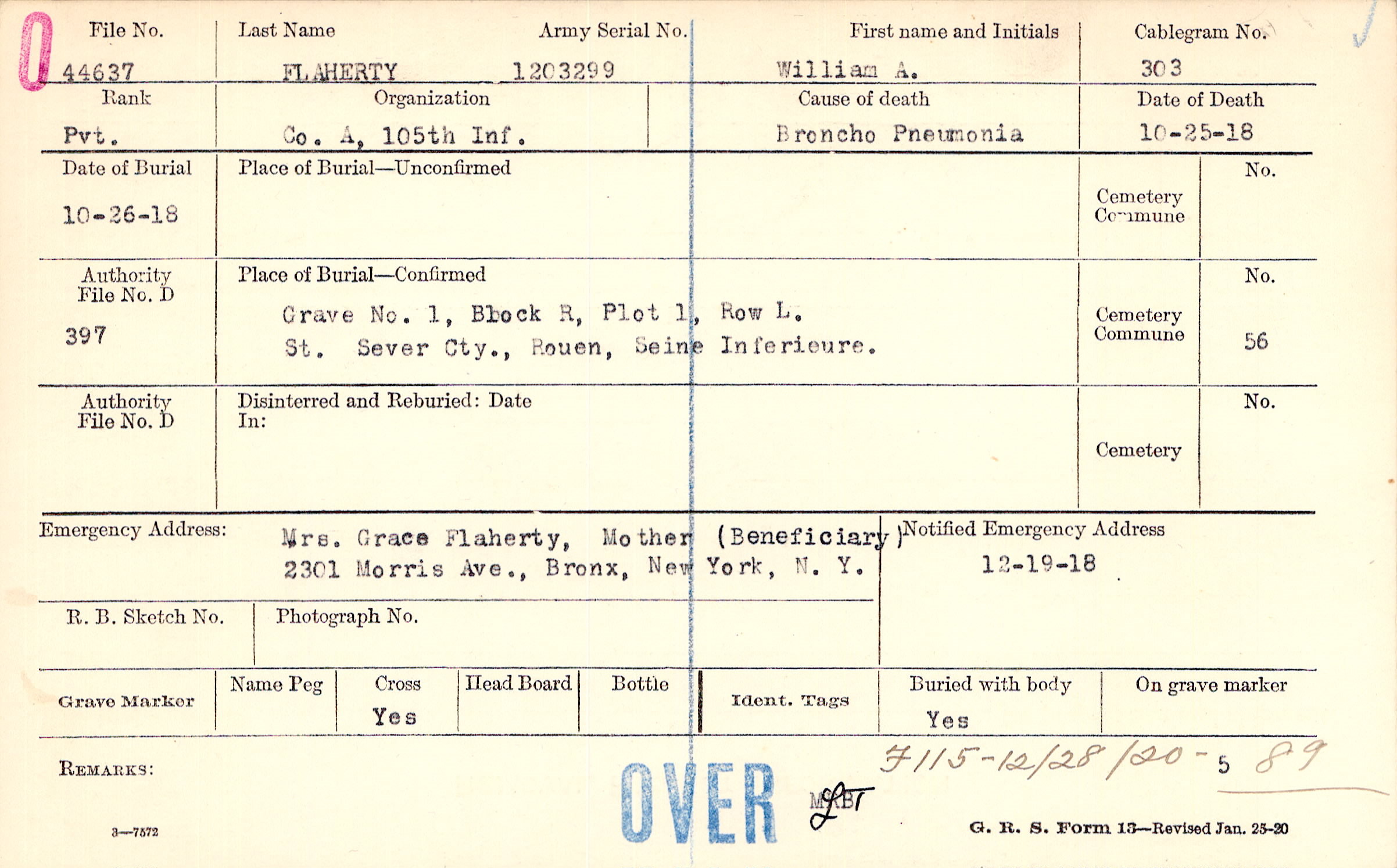 Mrs. Grace Flaherty, Mother, 2301 Morris Ave., Bronx, New York, N. Y., (Beneficiary)
