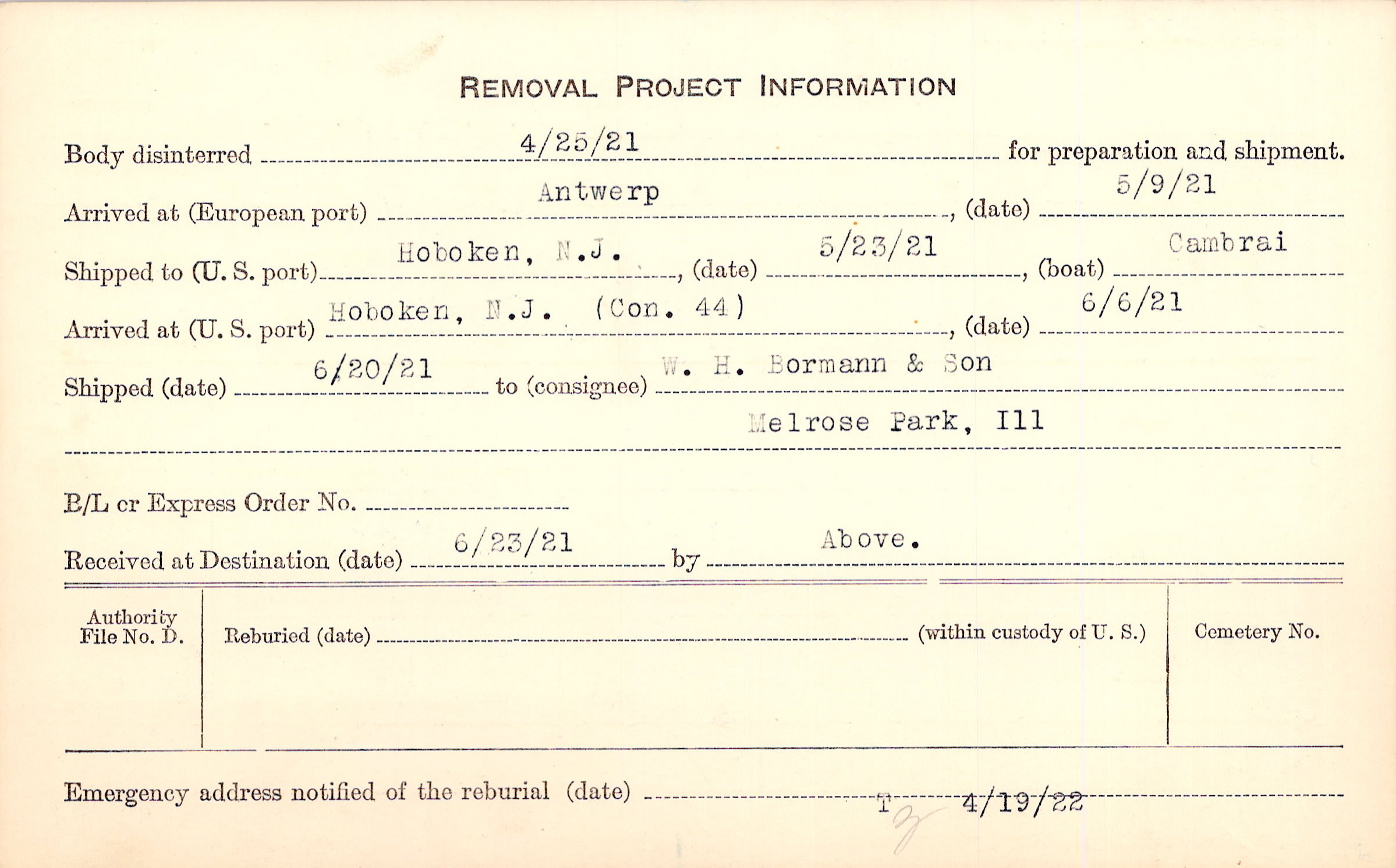 Body disinterred 4/25/1921 for preparation and shipment.