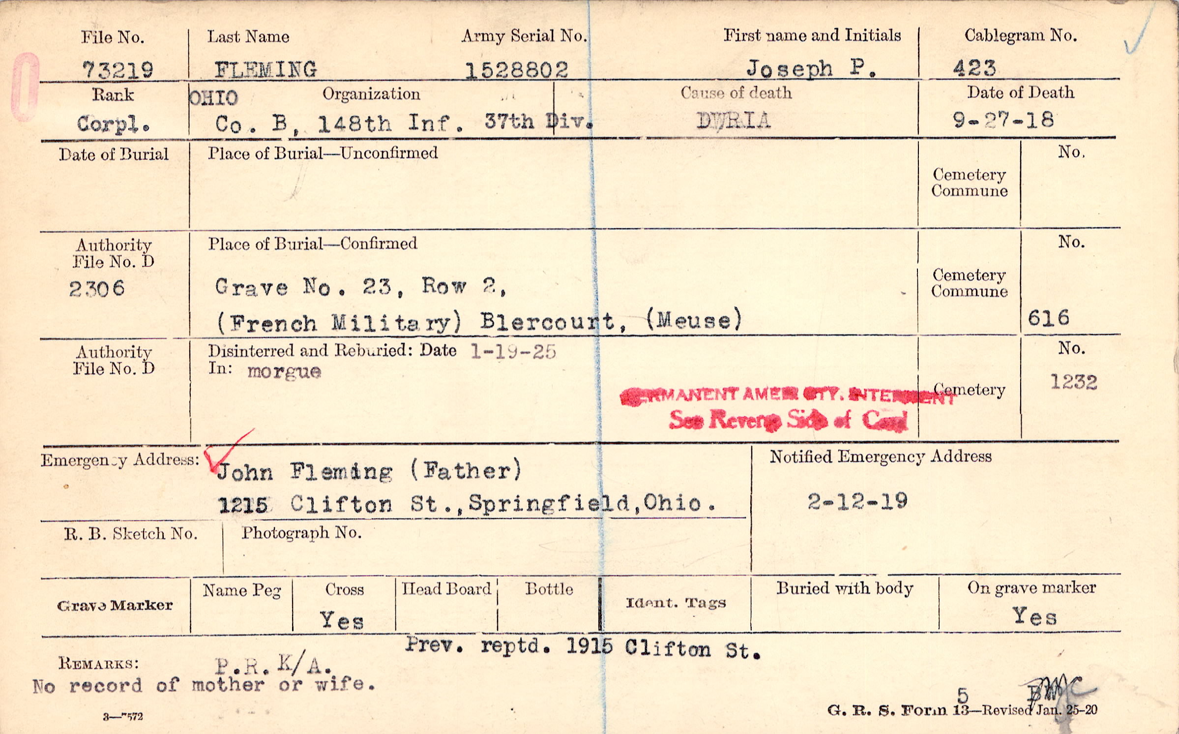 John Fleming (Father), 1215 Clifton St.,Springfield,Ohio.