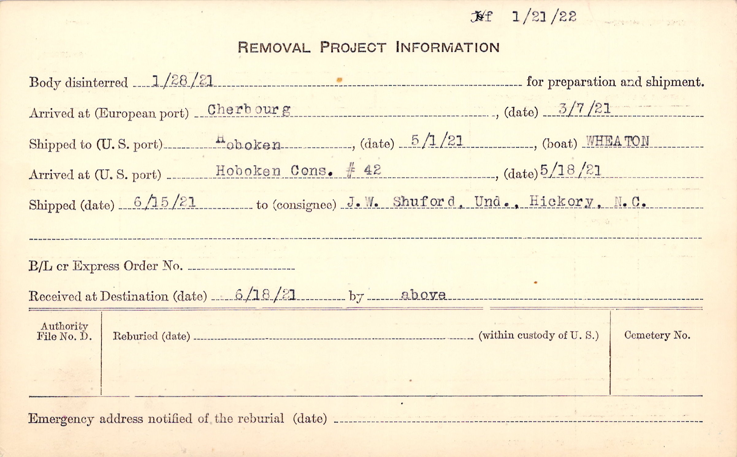Body disinterred 1/28/1921 for preparation and shipment.
