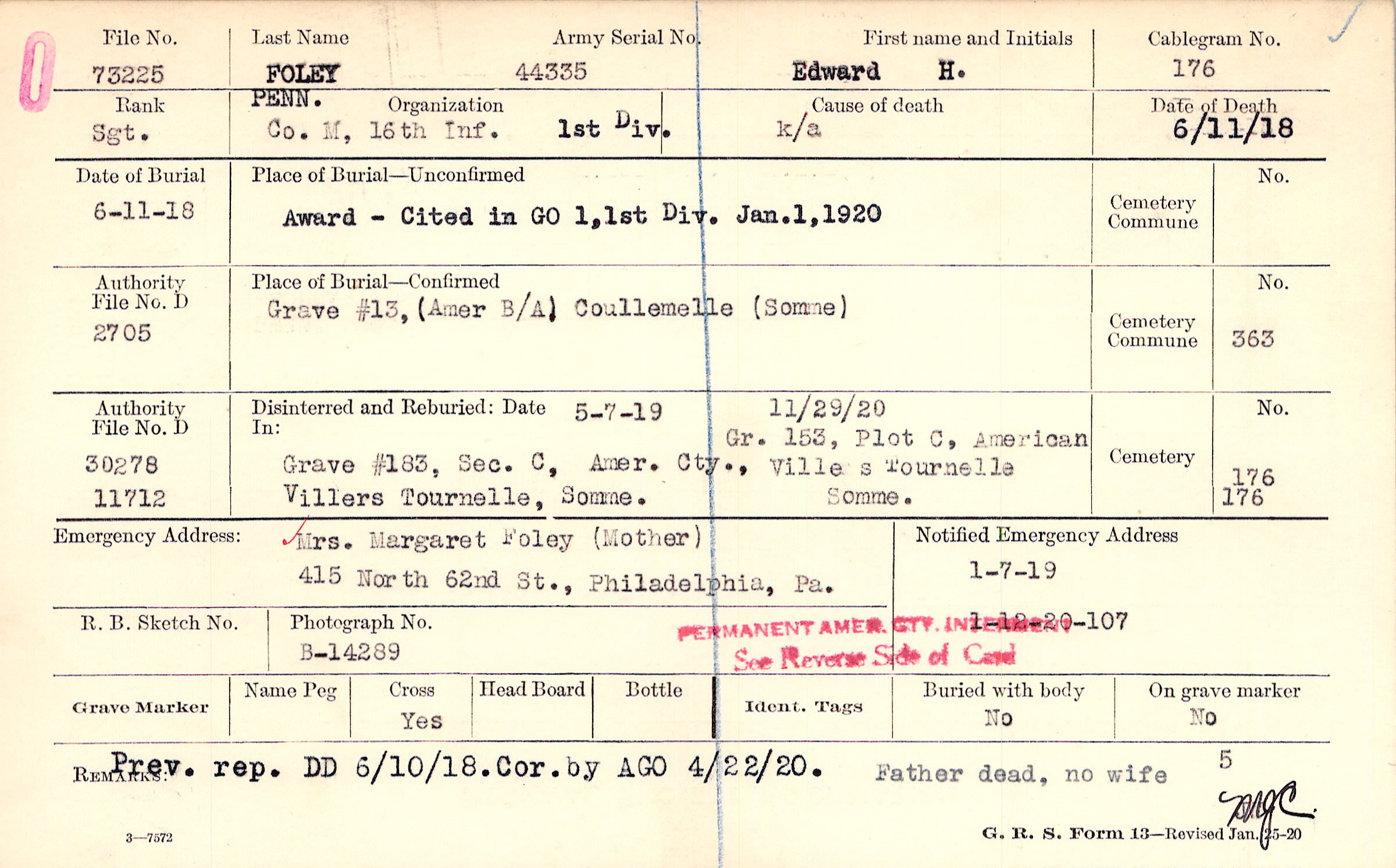 Mrs. Margaret Foley (mother), 415 North 62nd St., Philadelphia, Pa.