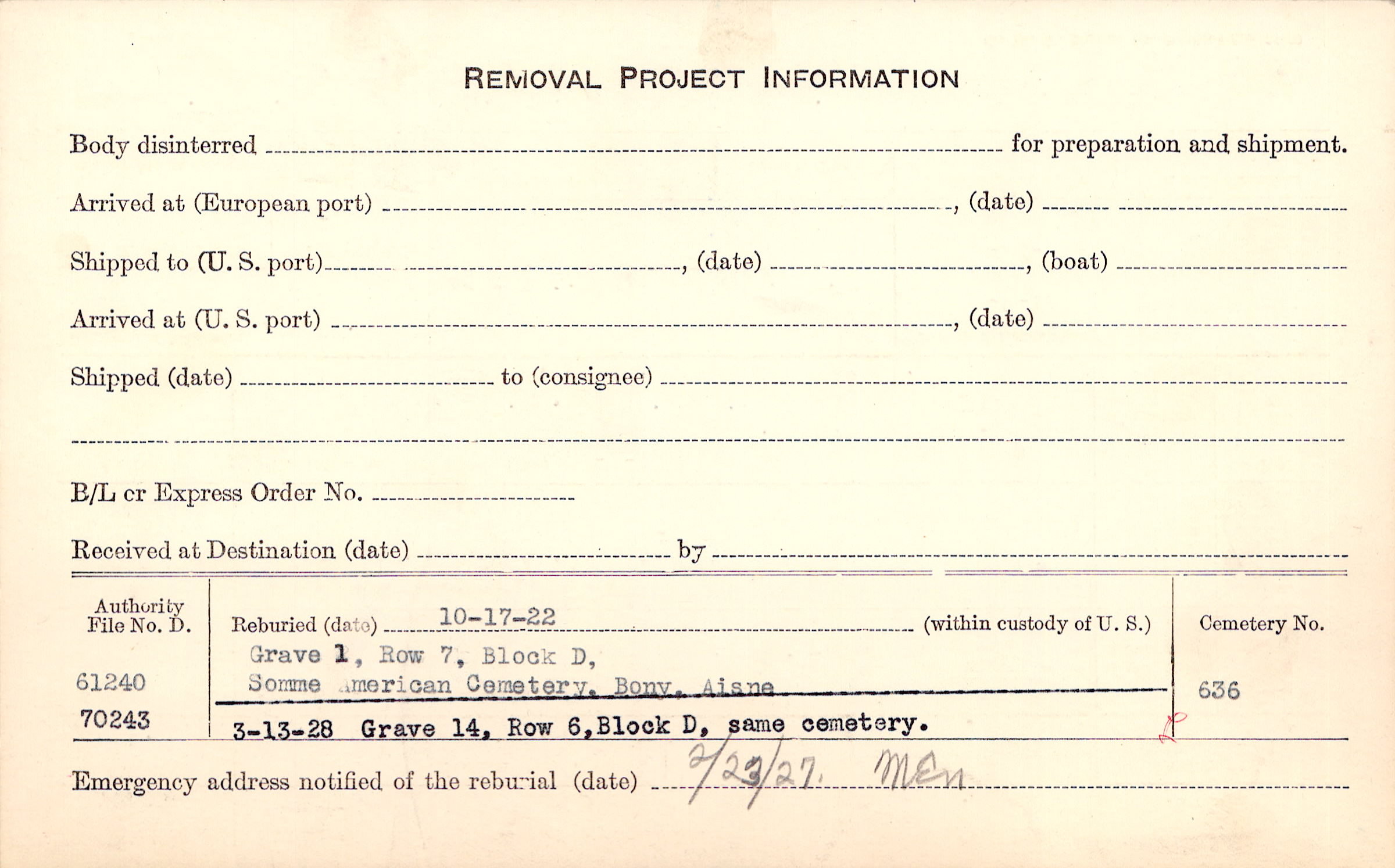 Prior Burial in Foreign Cemetery |