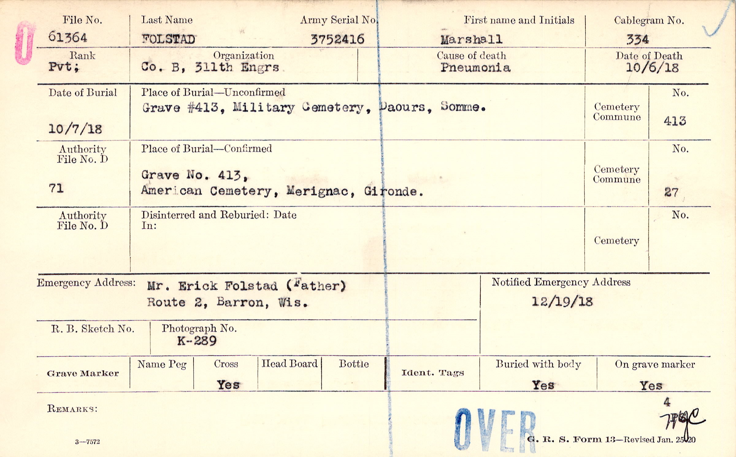 Grave 413, American Cemetery, Merignac, Gironde.