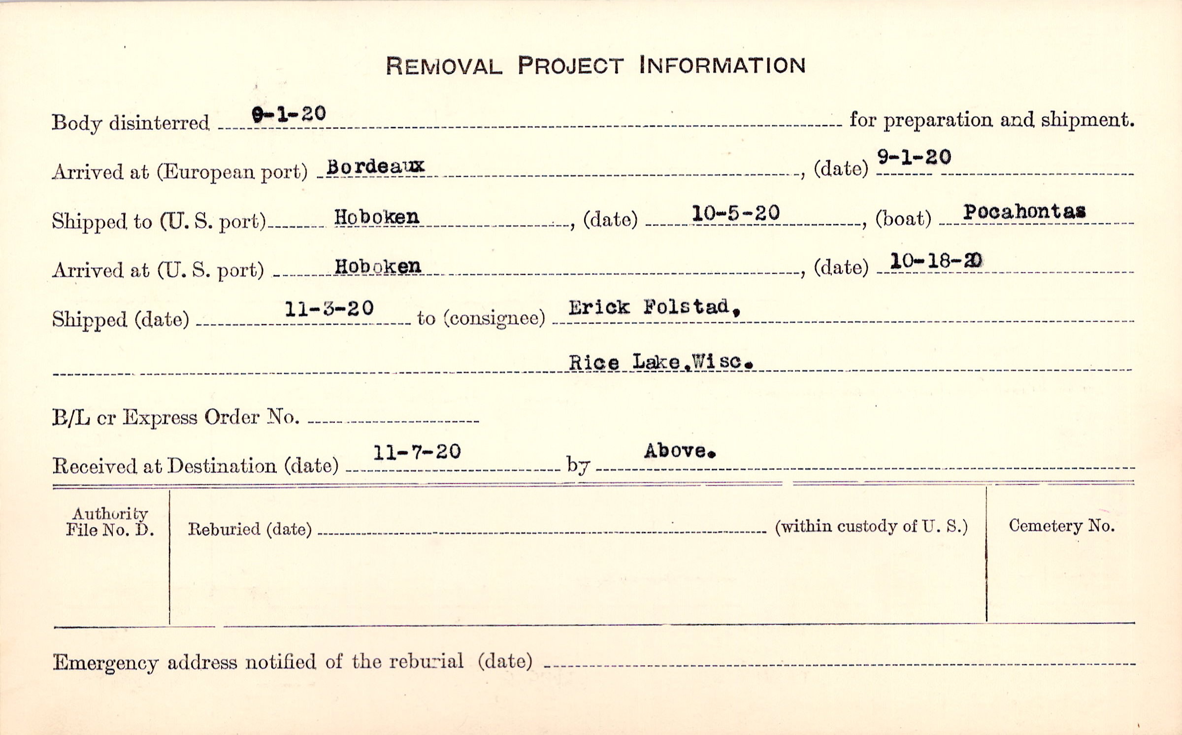 Body disinterred 9/1/1920 for preparation and shipment.