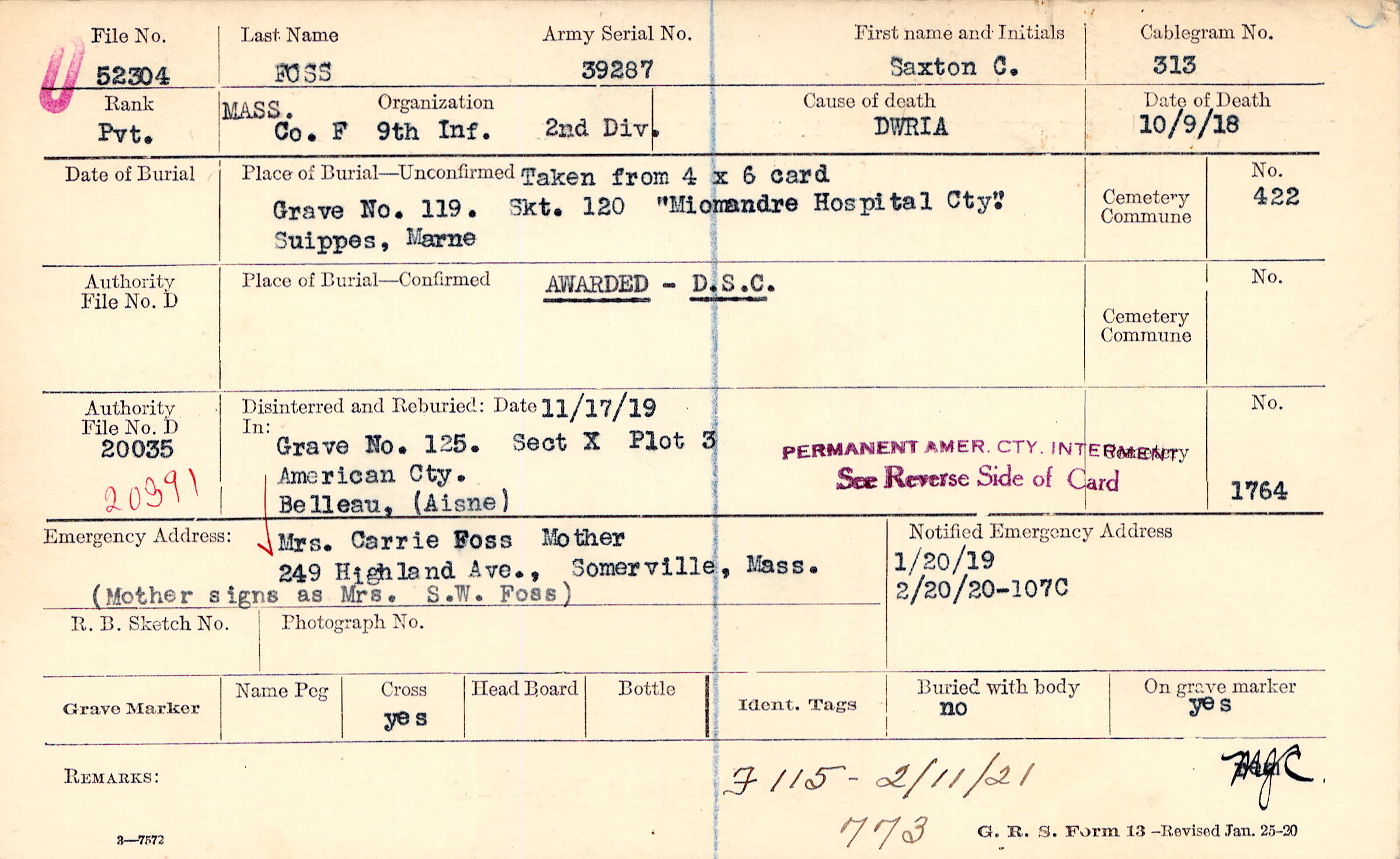 Mrs. Carrie Foss Mother, 249 Highland Ave., Somerville, Mass., (Mother signs as Mrs. S.W. Foss)