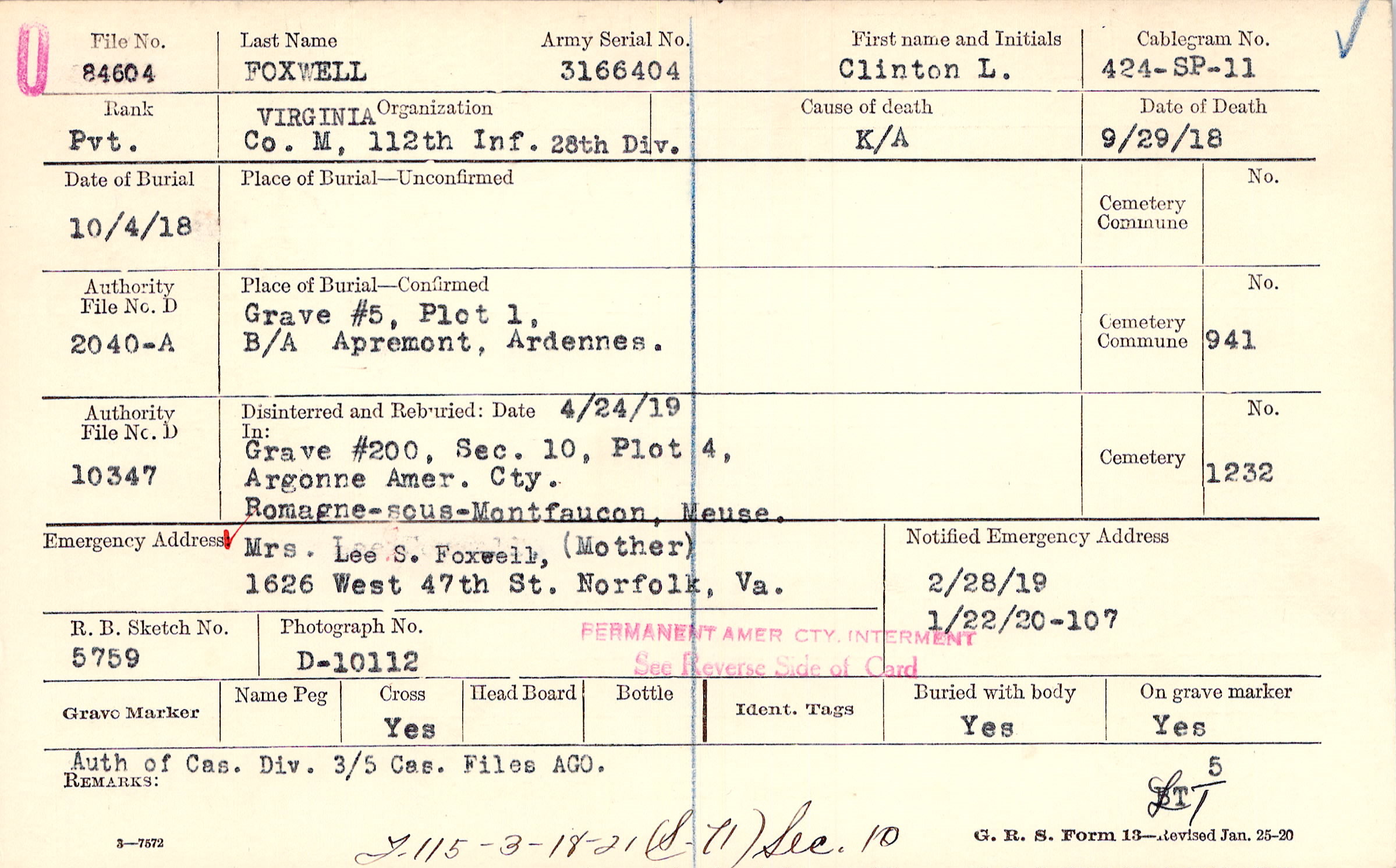 Mrs. Lee S. Foxwell, (Mother), 1626 West 47th St. Norfolk, Va.