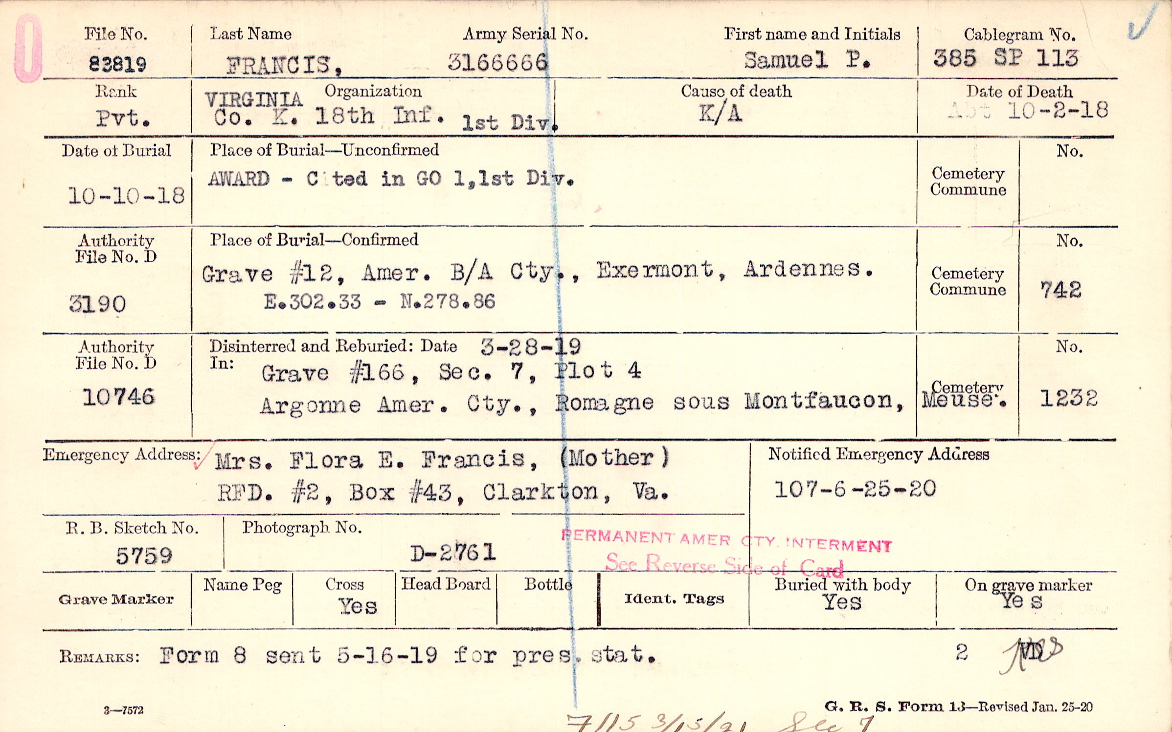 Mrs. Flora E. Francis, (Mother), RFD. #2, Box #43, Clarkton, Va.