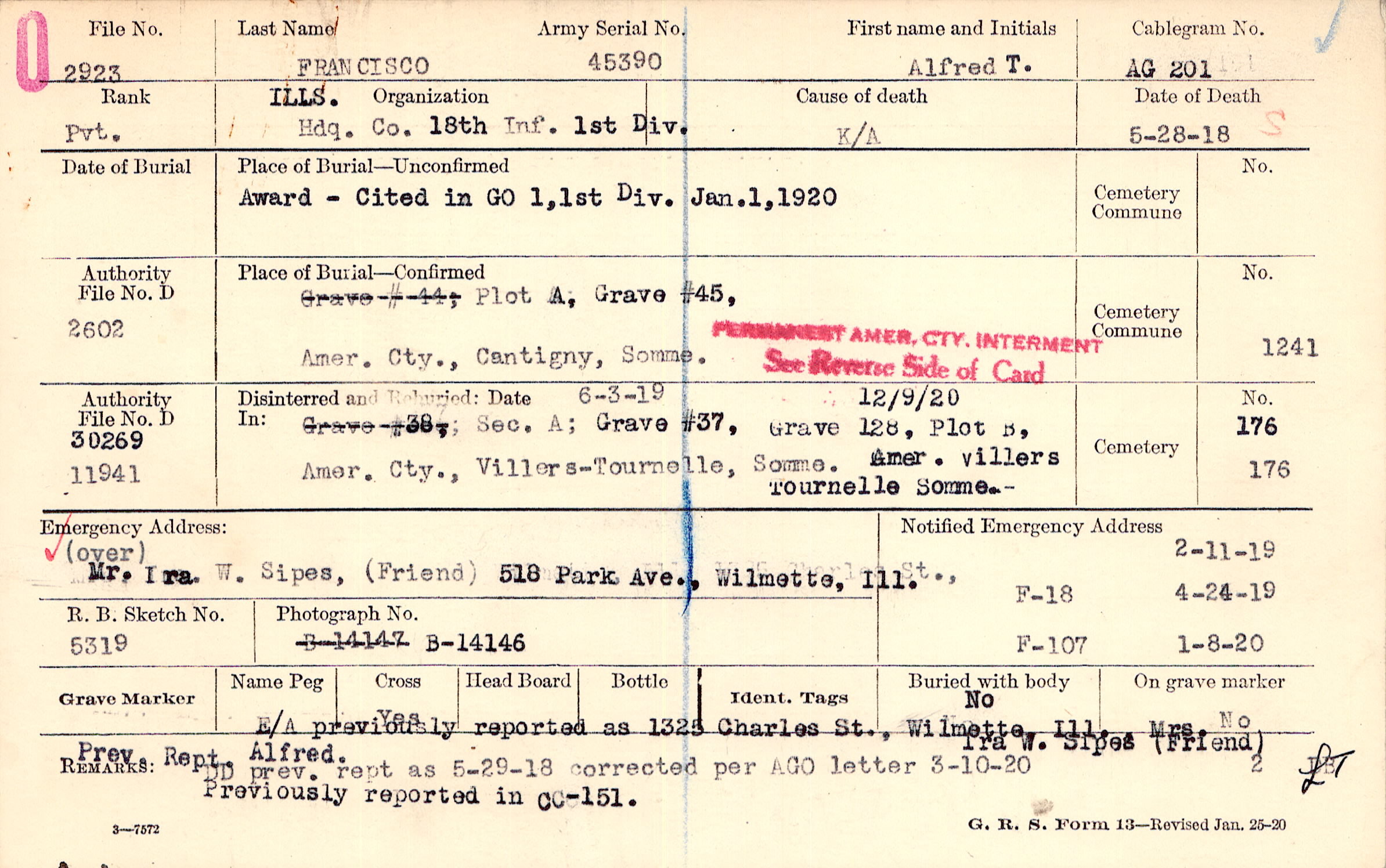 E/A previously reported as 1325 Charles St., Wilmatta, Ill, Mrs. Ira W. Sipes (Friend) Prev. Rept. Alfred. DD prev. rept as 5-29-18 corrected per AGO letter 3-10-20. Previously reported in CC151.
