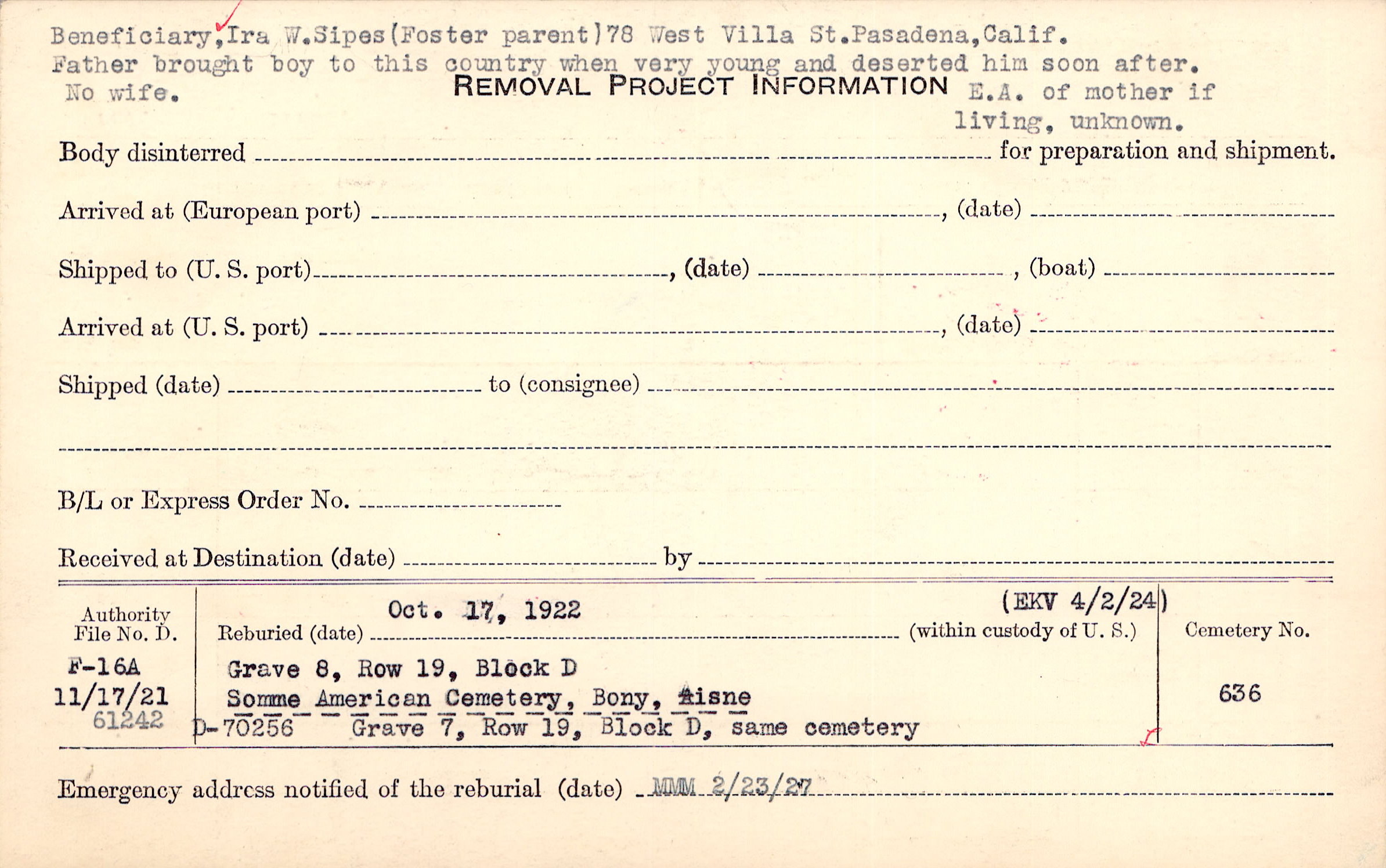 Beneficiary, Ira W. Sipes (Foster parent) 78 West Villa St. Pasadena, Calif. Father brought boy to this country when very young and deserted him soon after. No wife. E.A. of mother if living, unknown. |