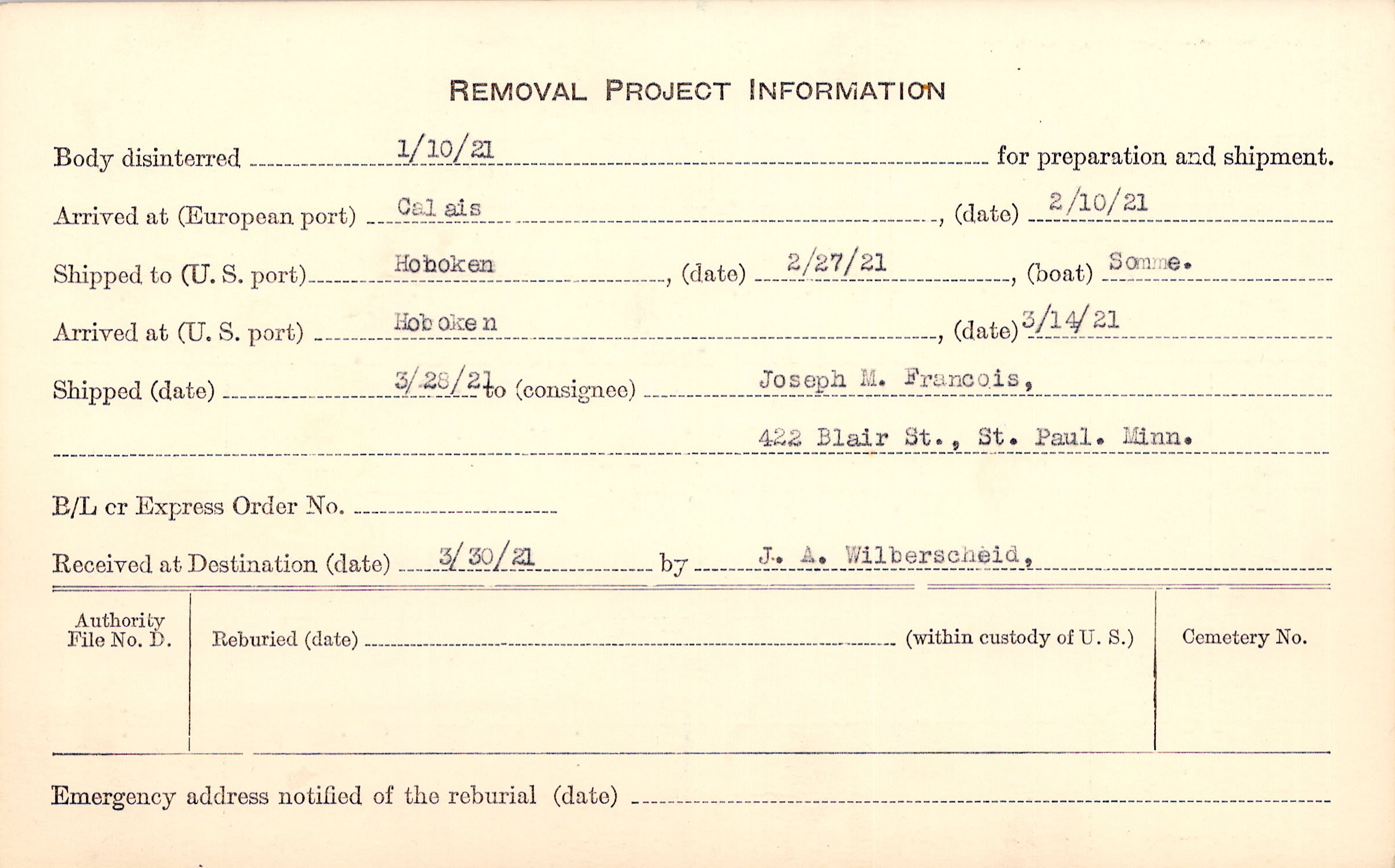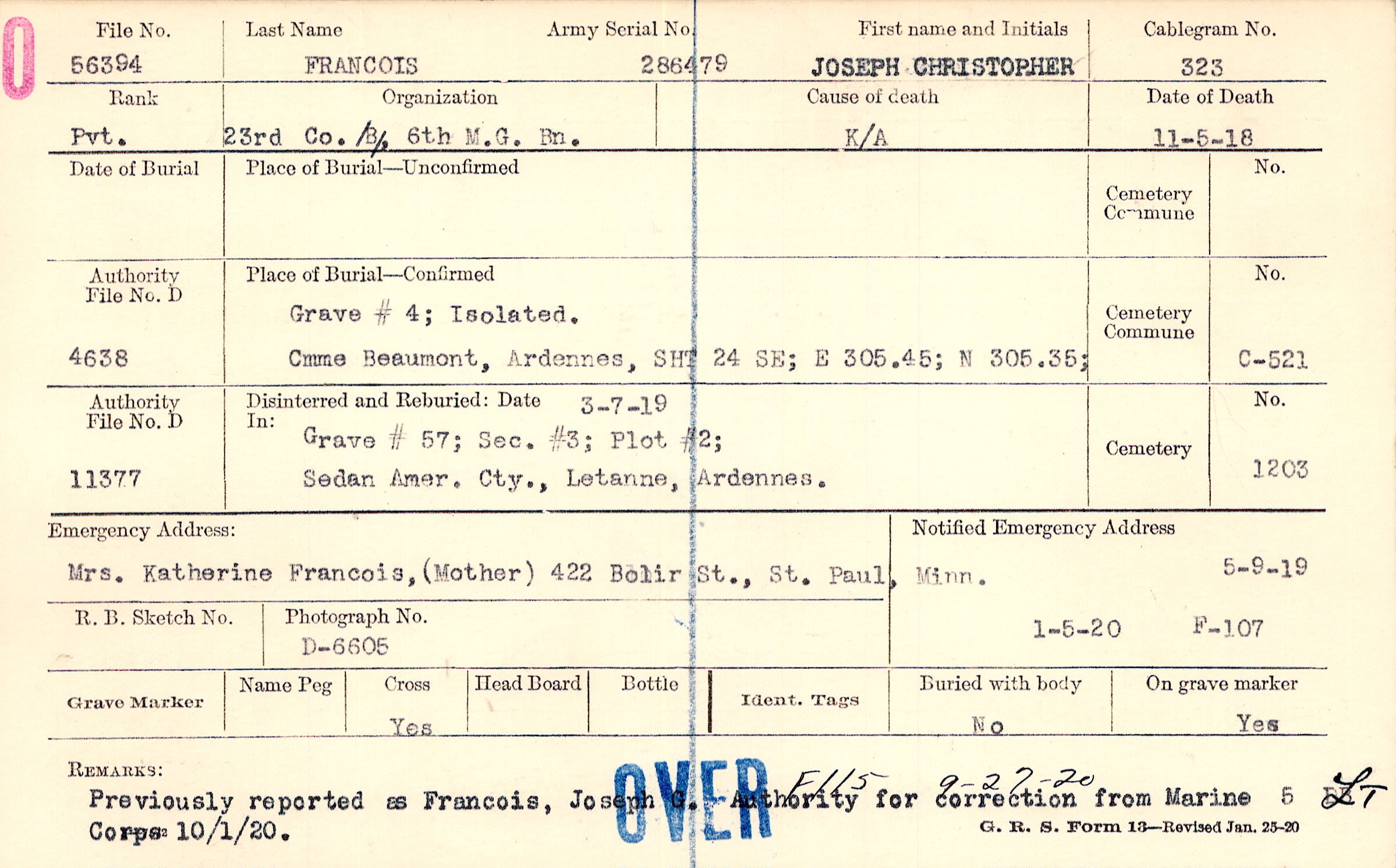 Mrs. Katherine Francois, (Mother), 422 Bolir St., St. Paul, Minn., Previously reported as Francois, Joseph G. Authority for correction from Marine Corps 10/1/20.